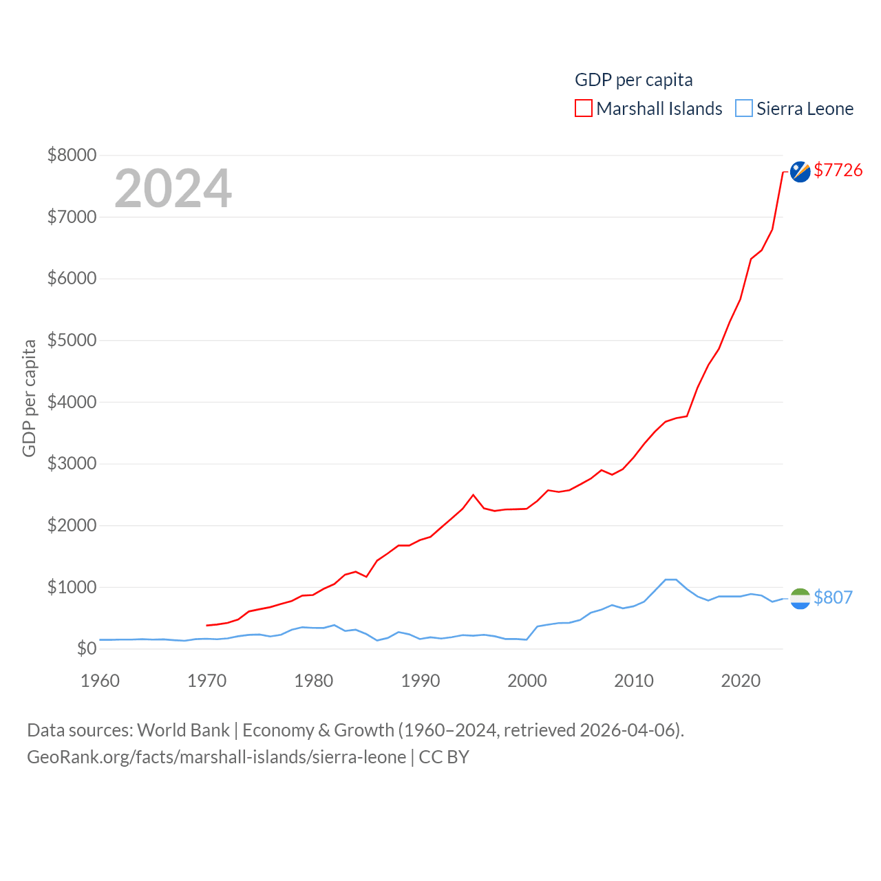 By GDP, The Marshall Islands ranks 193/197 ($290M) and Sierra Leone ranks 160/197 ($6.97B). By GDP per capita, The Marshall Islands ranks 96/197 ($7,726), while Sierra Leone ranks 186/197 ($807).