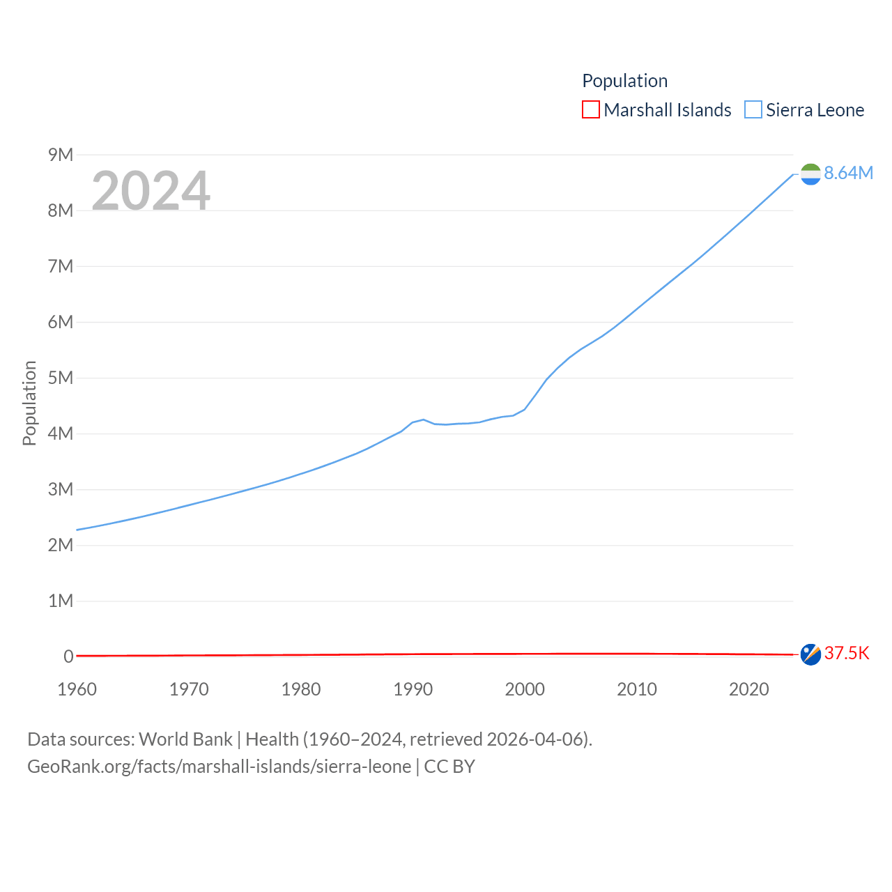 The Marshall Islands has a population of 37.5K (ranked 192/197), compared with 8.64M in Sierra Leone (ranked 102/197). The Marshall Islands' land area is 69.5 sq mi versus 27,869 sq mi for Sierra Leone (ranked 191st vs. 116th).