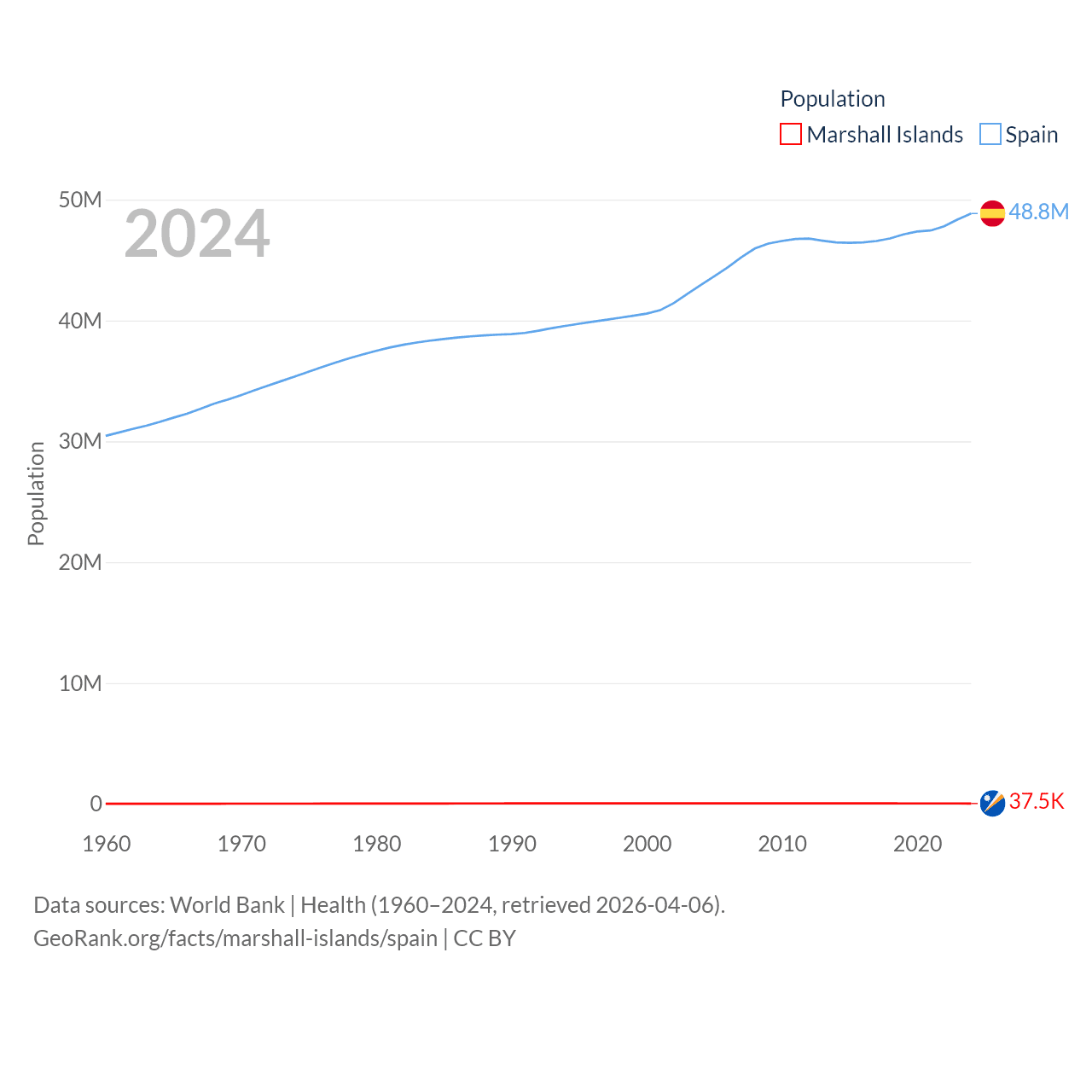The Marshall Islands has a population of 37.5K (ranked 192/197), compared with 48.8M in Spain (ranked 32/197). The Marshall Islands' land area is 69.5 sq mi versus 192,934 sq mi for Spain (ranked 191st vs. 51st).