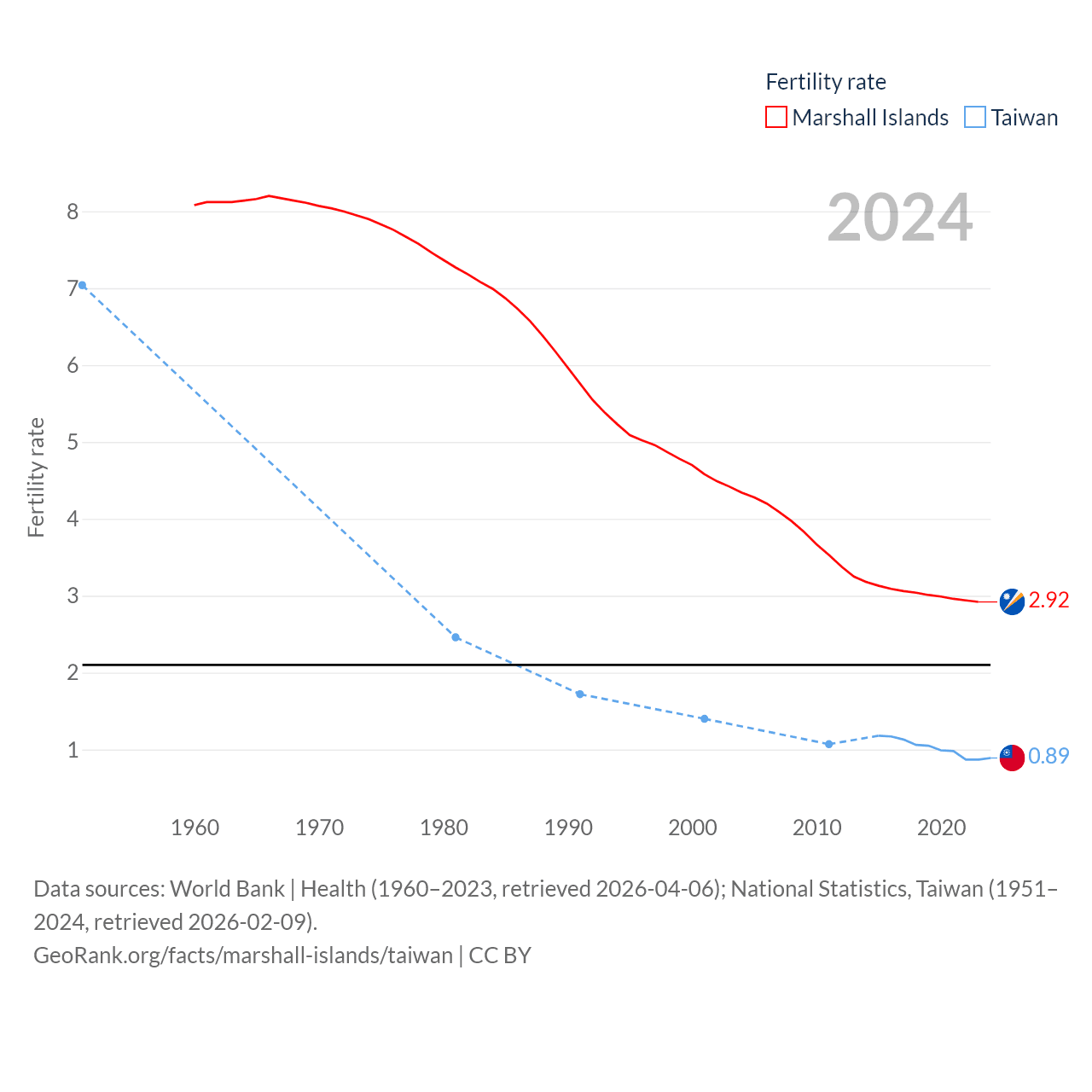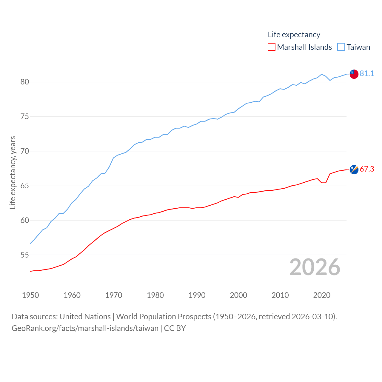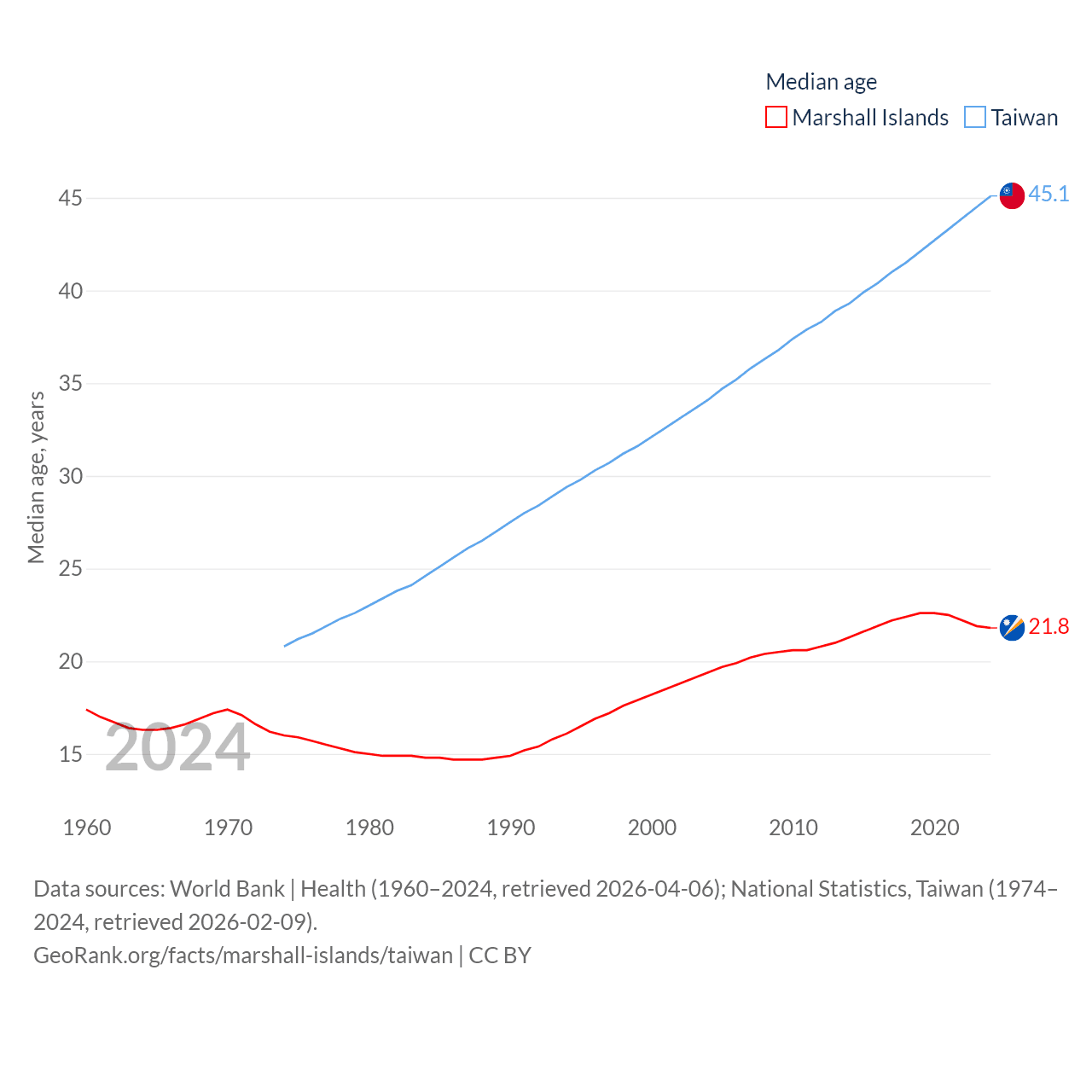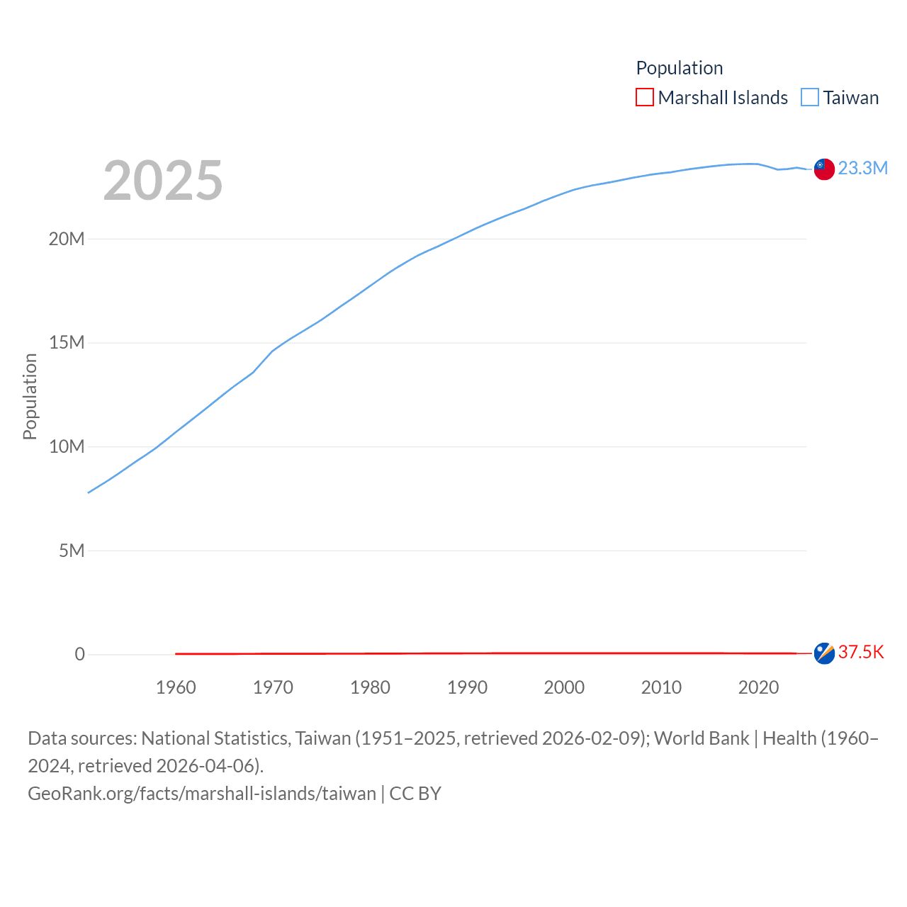 The Marshall Islands has a population of 37.5K (ranked 192/197), compared with 23.3M in Taiwan (ranked 60/197). The Marshall Islands' land area is 69.5 sq mi versus 13,976 sq mi for Taiwan (ranked 191st vs. 133rd).