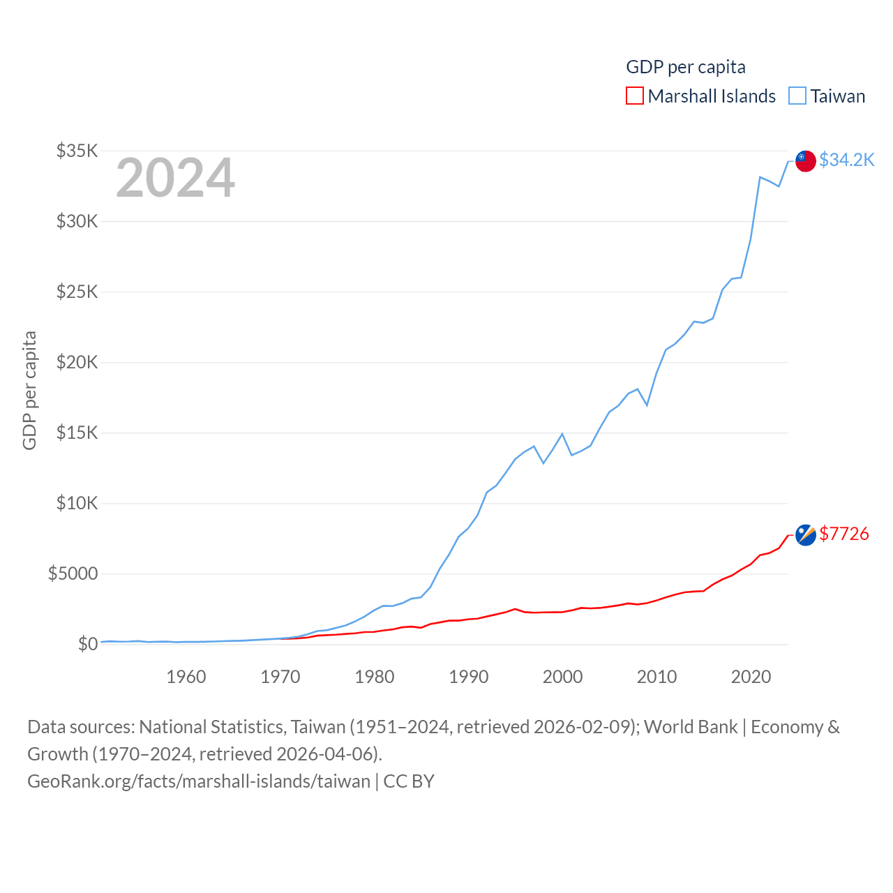 By GDP, The Marshall Islands ranks 193/197 ($290M) and Taiwan ranks 22/197 ($802B). By GDP per capita, The Marshall Islands ranks 96/197 ($7,726), while Taiwan ranks 35/197 ($34,238).