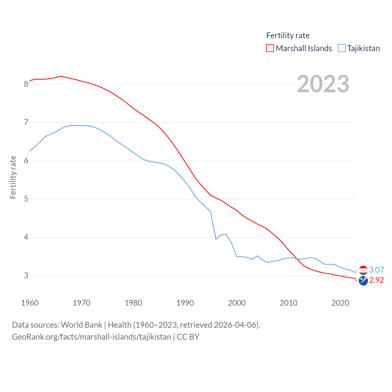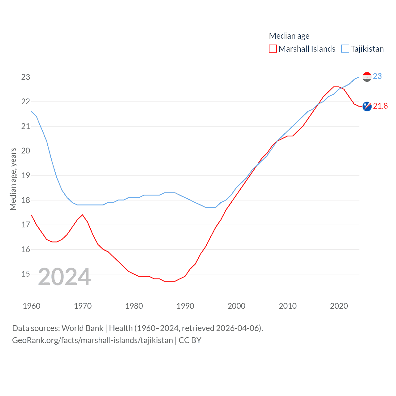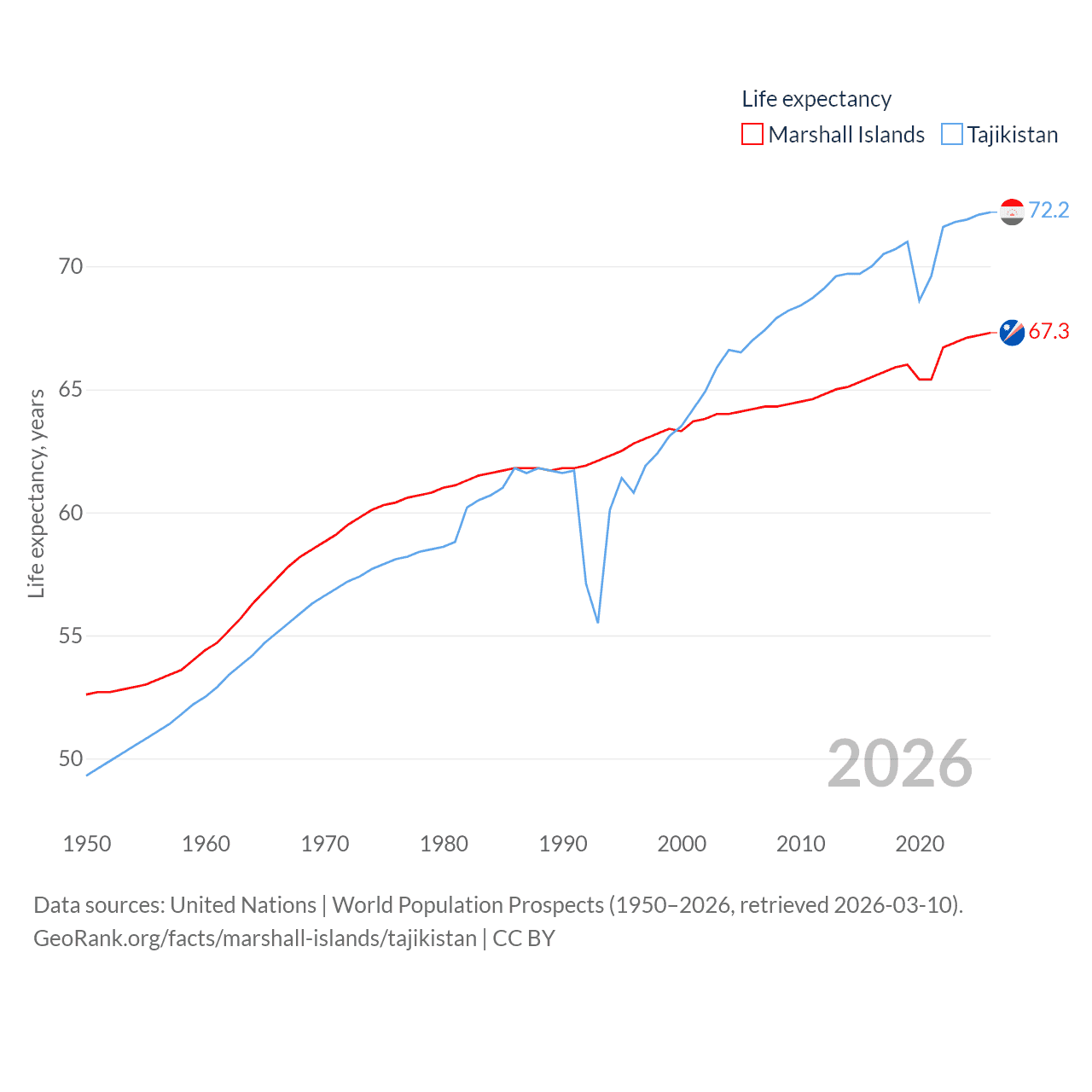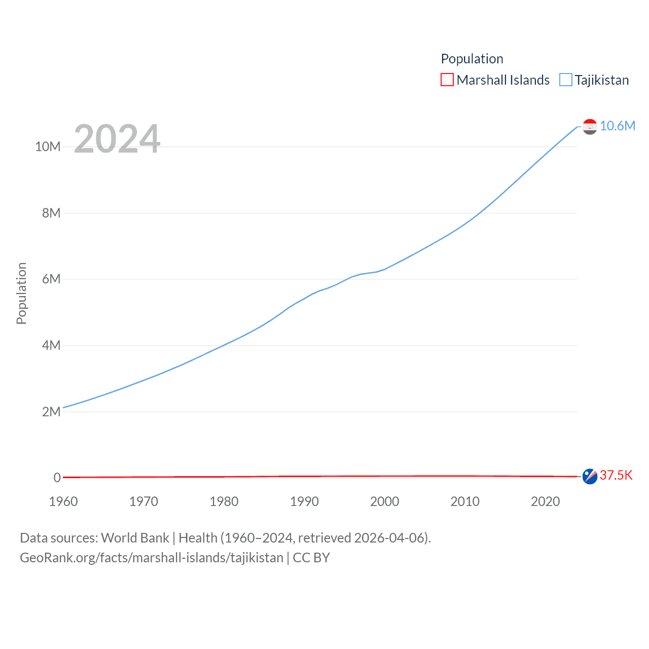 The Marshall Islands has a population of 37.5K (ranked 192/197), compared with 10.6M in Tajikistan (ranked 91/197). The Marshall Islands' land area is 69.5 sq mi versus 53,587 sq mi for Tajikistan (ranked 191st vs. 93rd).