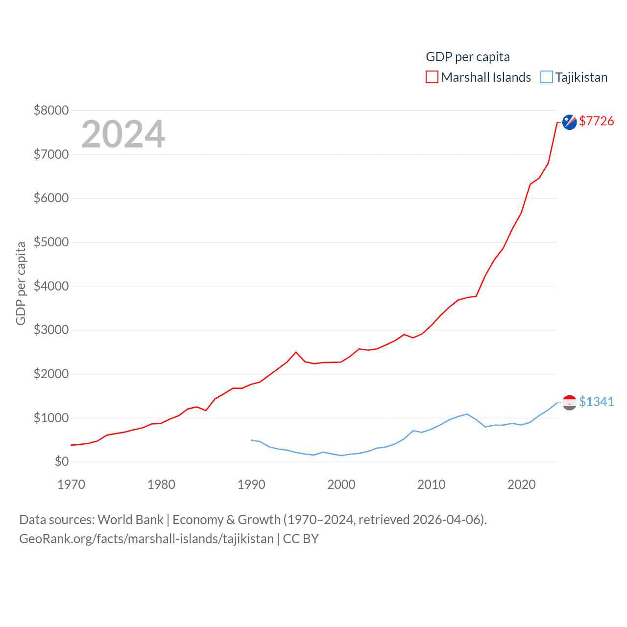 By GDP, The Marshall Islands ranks 193/197 ($290M) and Tajikistan ranks 145/197 ($14.2B). By GDP per capita, The Marshall Islands ranks 96/197 ($7,726), while Tajikistan ranks 166/197 ($1,341).
