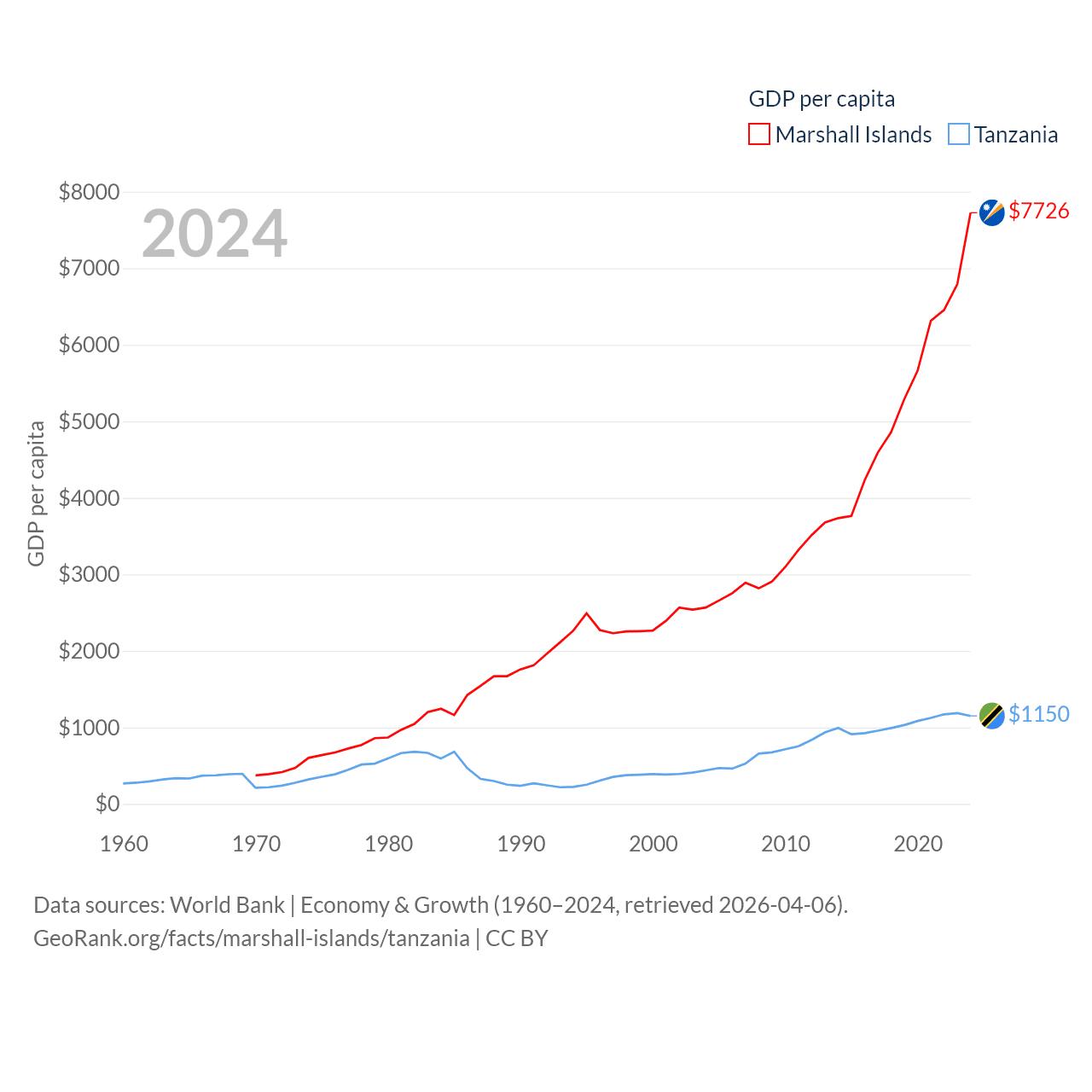 By GDP, The Marshall Islands ranks 193/197 ($290M) and Tanzania ranks 82/197 ($78.8B). By GDP per capita, The Marshall Islands ranks 96/197 ($7,726), while Tanzania ranks 170/197 ($1,150).