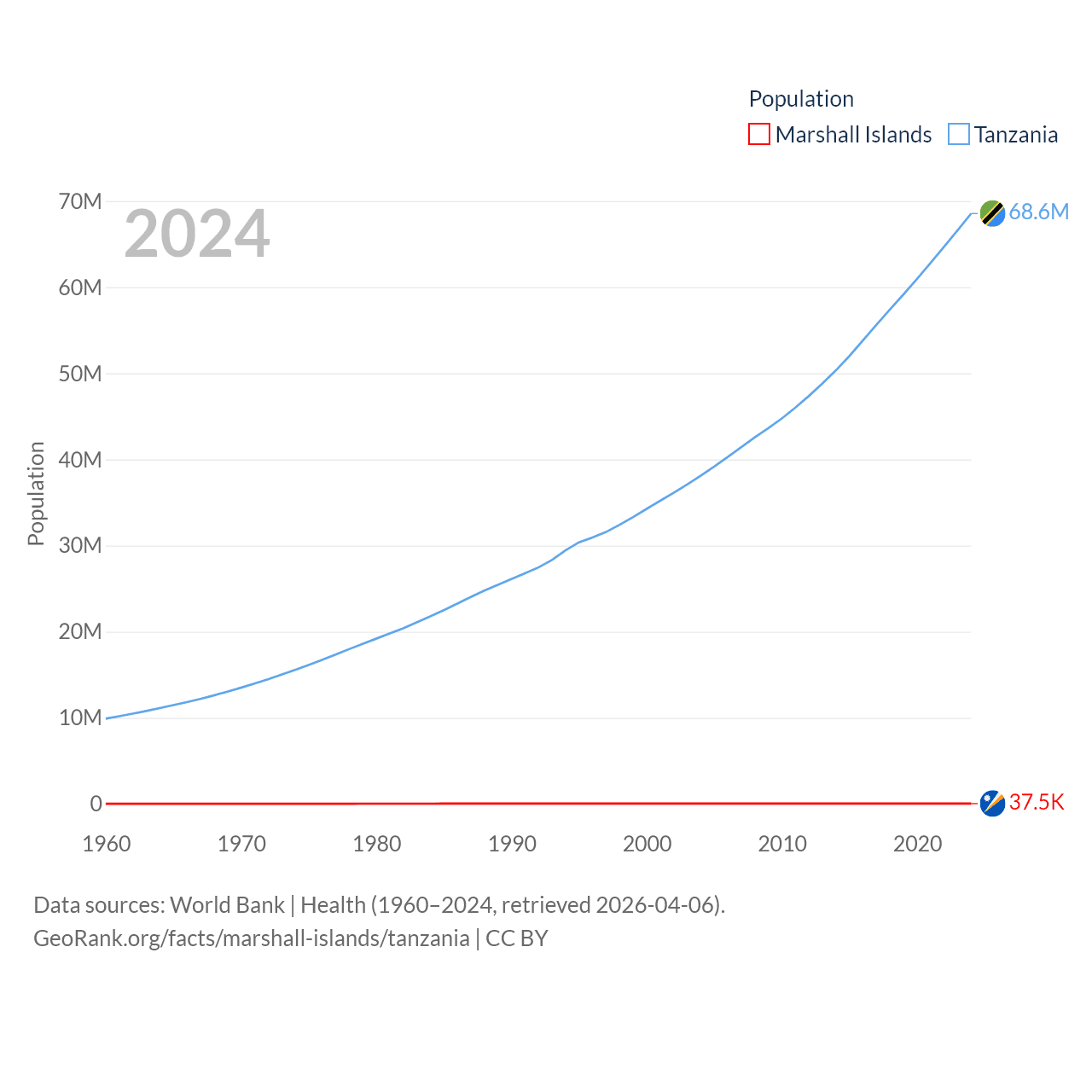 The Marshall Islands has a population of 37.5K (ranked 192/197), compared with 68.6M in Tanzania (ranked 22/197). The Marshall Islands' land area is 69.5 sq mi versus 342,009 sq mi for Tanzania (ranked 191st vs. 31st).