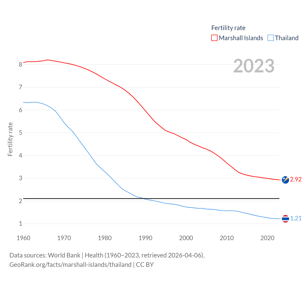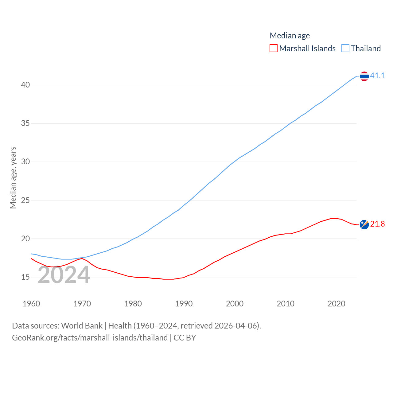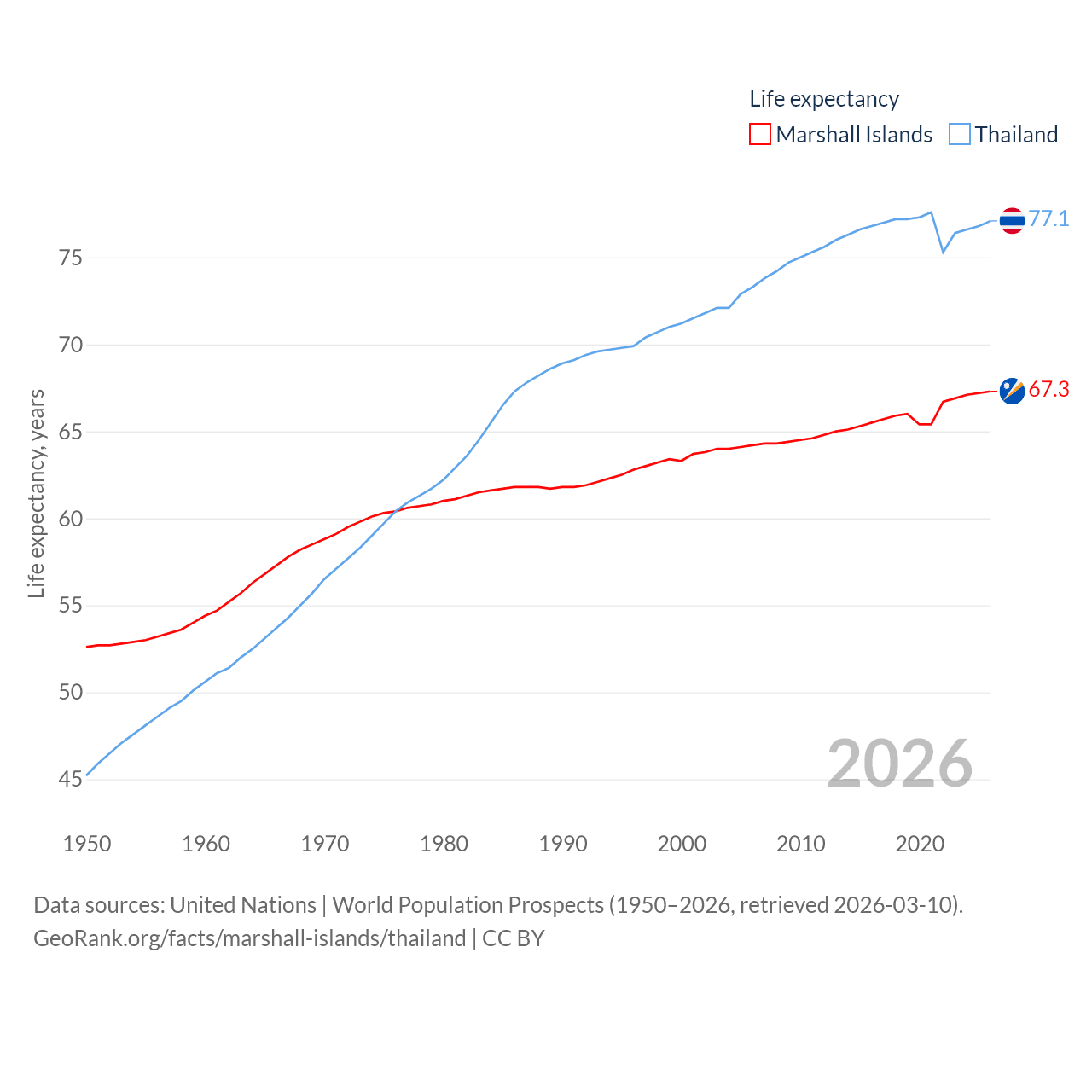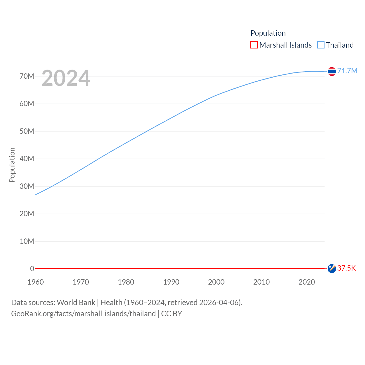 The Marshall Islands has a population of 37.5K (ranked 192/197), compared with 71.7M in Thailand (ranked 20/197). The Marshall Islands' land area is 69.5 sq mi versus 197,256 sq mi for Thailand (ranked 191st vs. 50th).