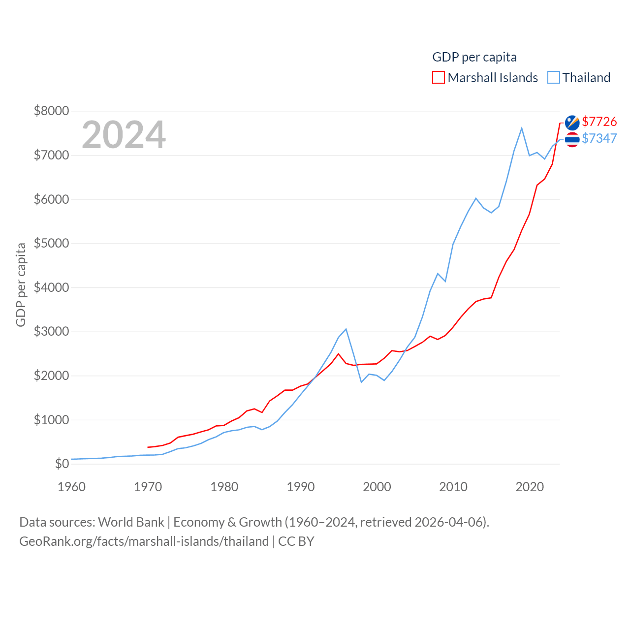 By GDP, The Marshall Islands ranks 193/197 ($290M) and Thailand ranks 31/197 ($527B). By GDP per capita, The Marshall Islands ranks 96/197 ($7,726), while Thailand ranks 100/197 ($7,347).