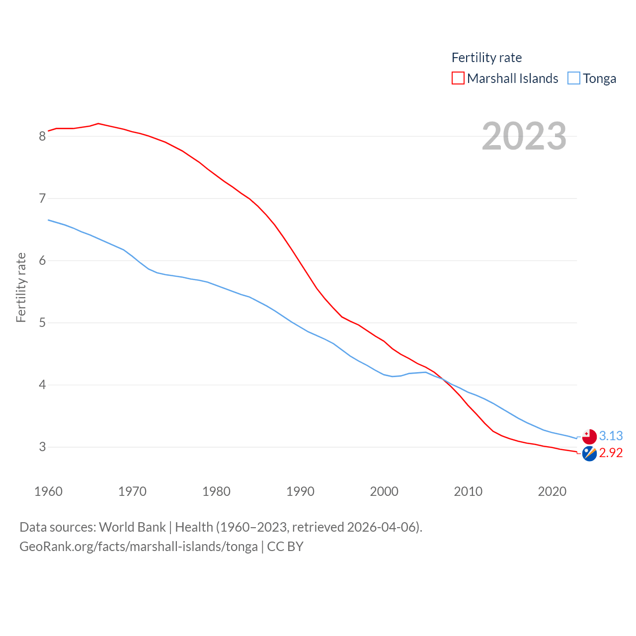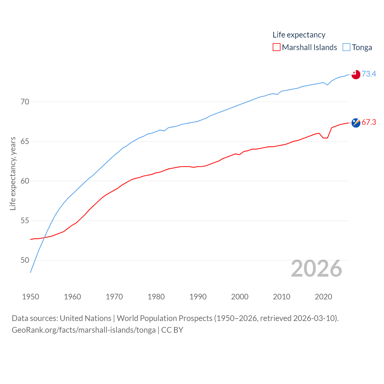 The Marshall Islands has a population of 37.5K (ranked 192/197), compared with 104K in Tonga (ranked 183/197). The Marshall Islands' land area is 69.5 sq mi versus 278 sq mi for Tonga (ranked 191st vs. 176th).
