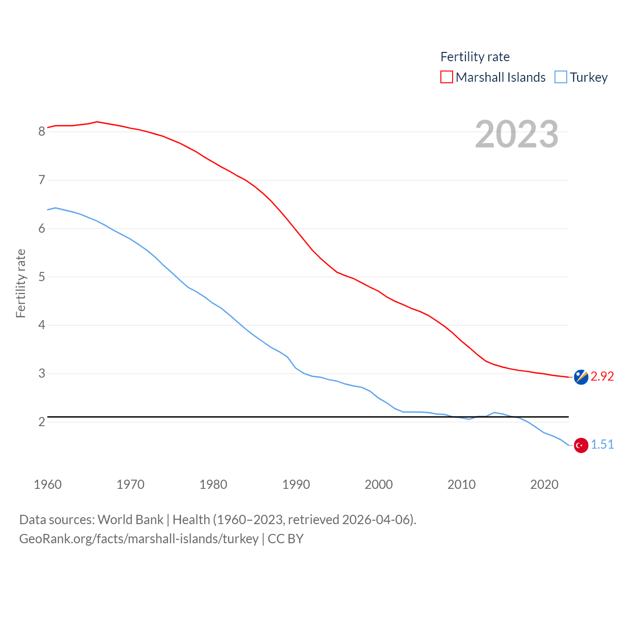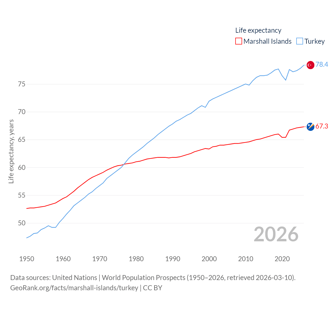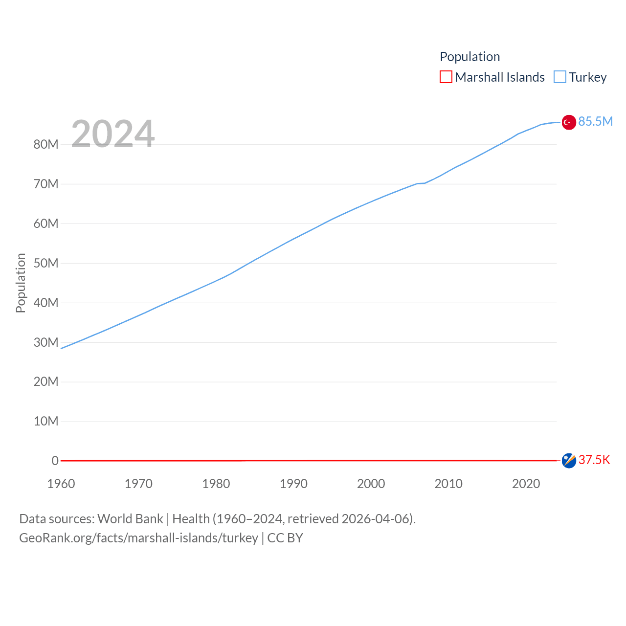 The Marshall Islands has a population of 37.5K (ranked 192/197), compared with 85.5M in Turkey (ranked 18/197). The Marshall Islands' land area is 69.5 sq mi versus 297,156 sq mi for Turkey (ranked 191st vs. 36th).
