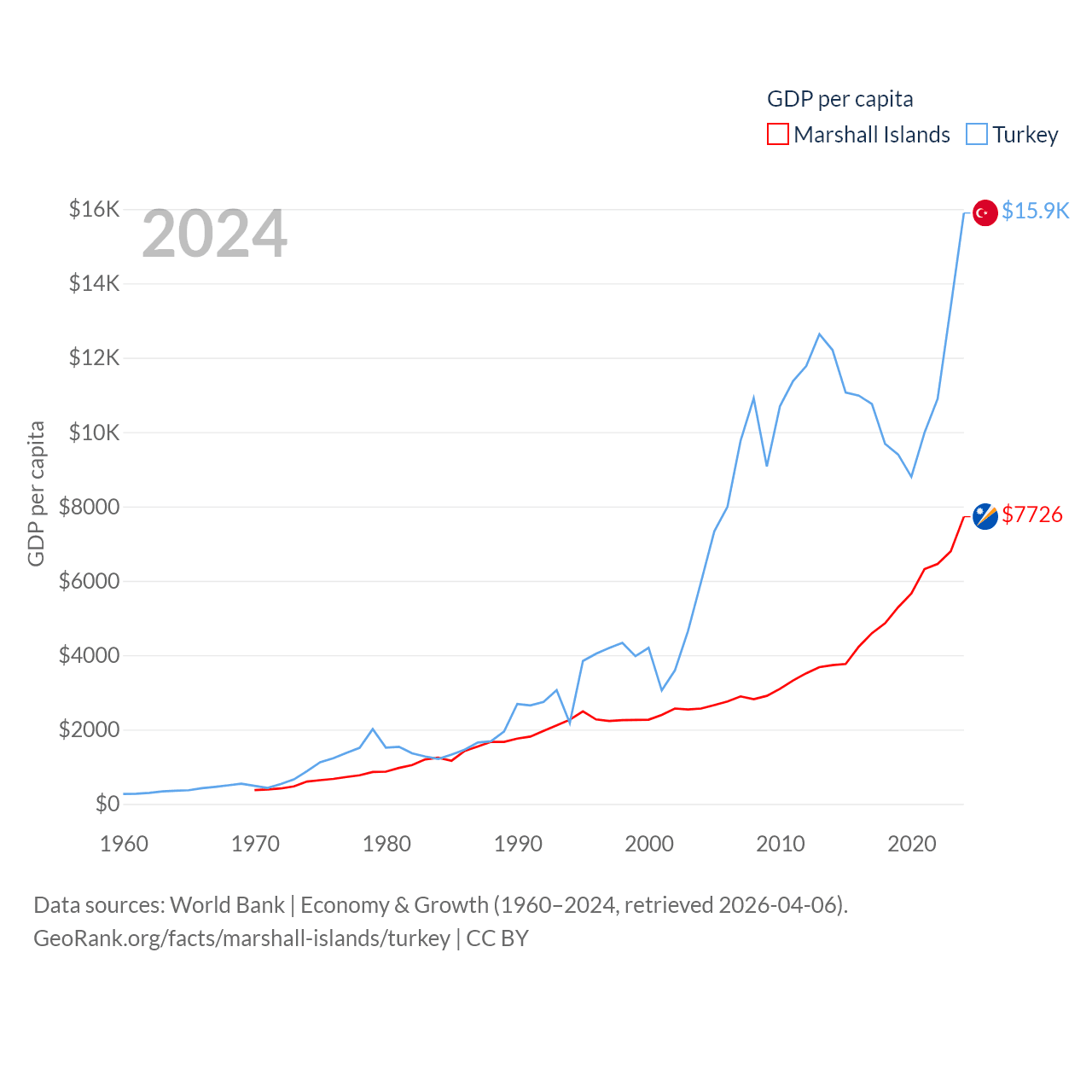 By GDP, The Marshall Islands ranks 193/197 ($290M) and Turkey ranks 17/197 ($1.36T). By GDP per capita, The Marshall Islands ranks 96/197 ($7,726), while Turkey ranks 66/197 ($15,893).