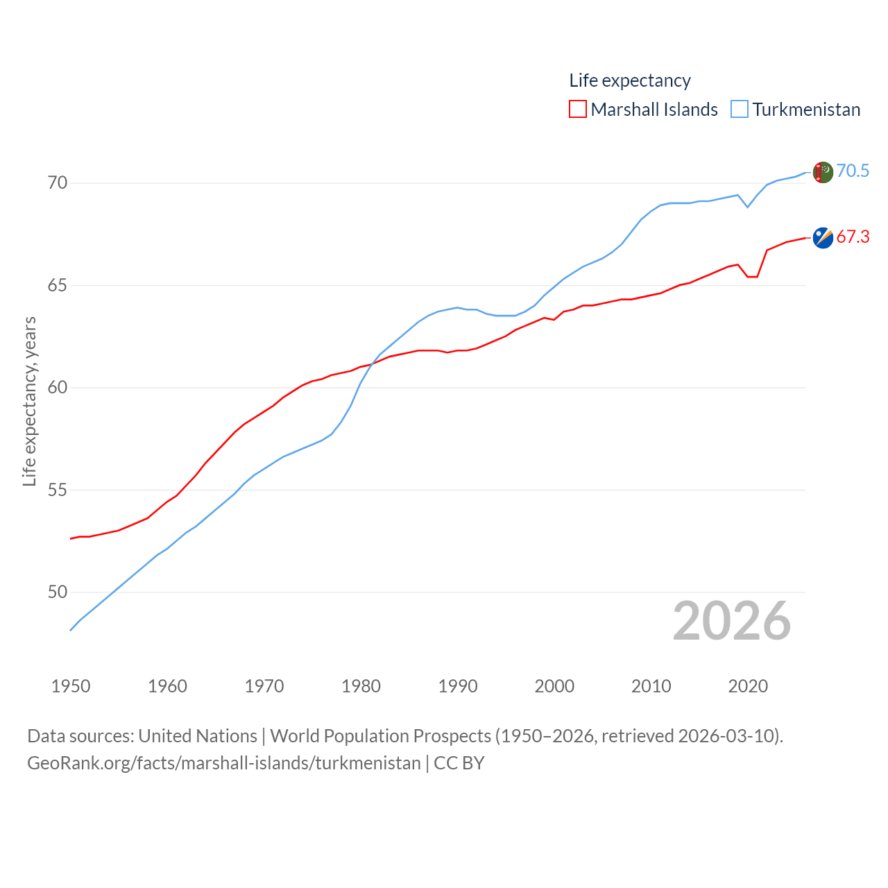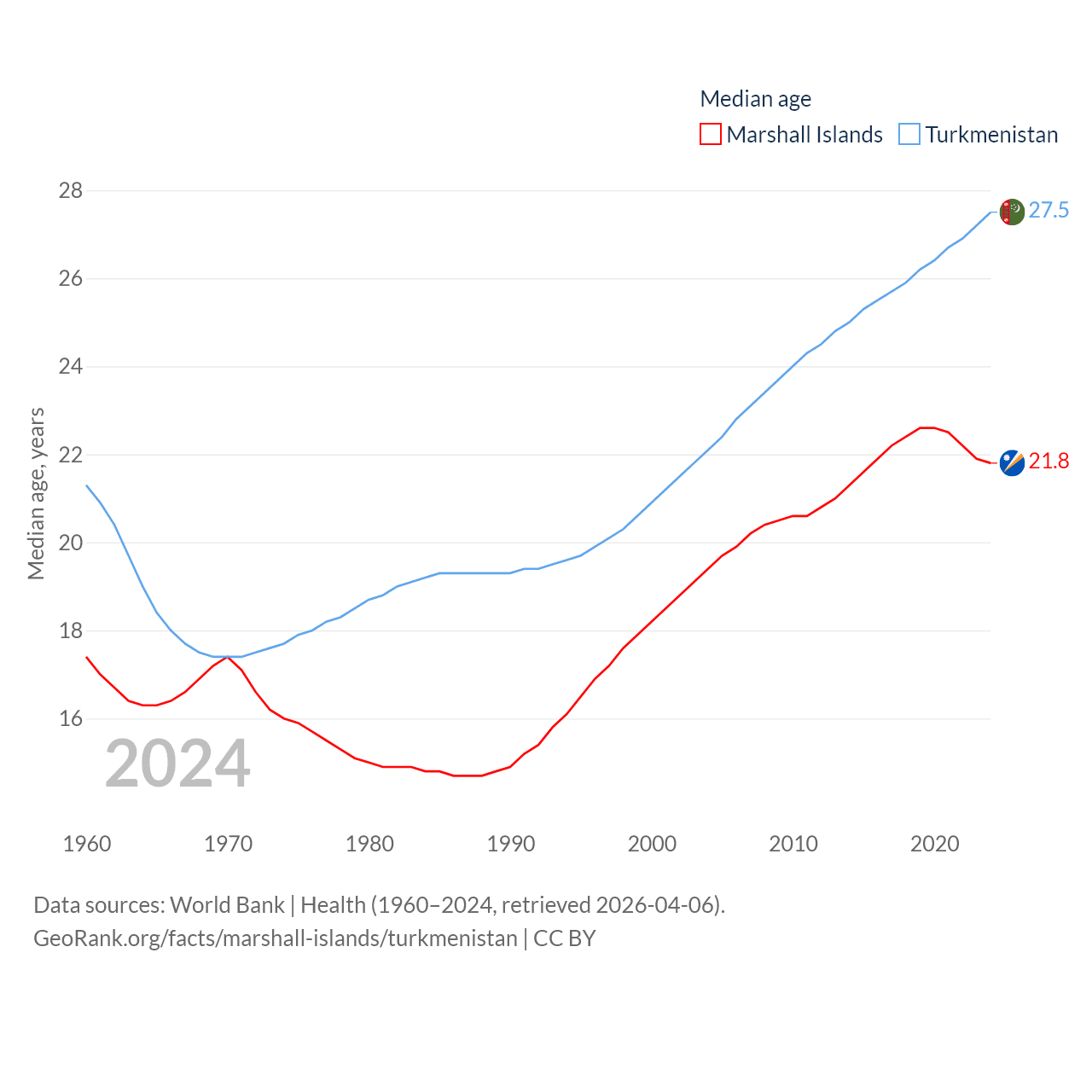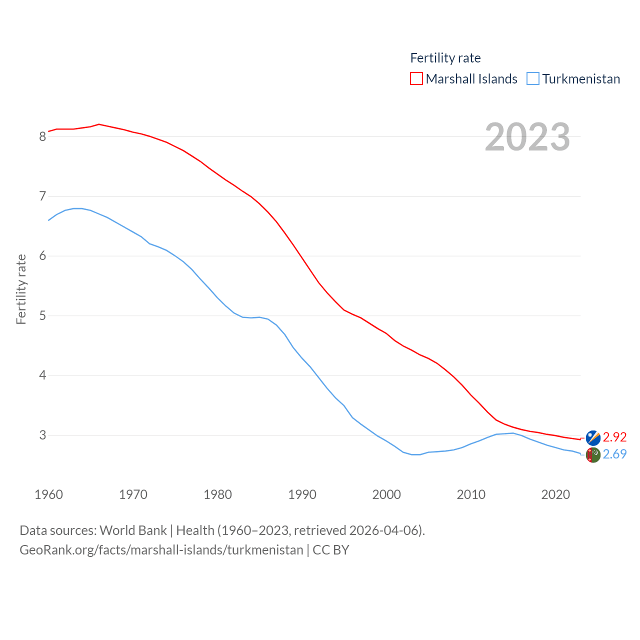 The Marshall Islands has a population of 37.5K (ranked 192/197), compared with 7.49M in Turkmenistan (ranked 104/197). The Marshall Islands' land area is 69.5 sq mi versus 181,441 sq mi for Turkmenistan (ranked 191st vs. 53rd).