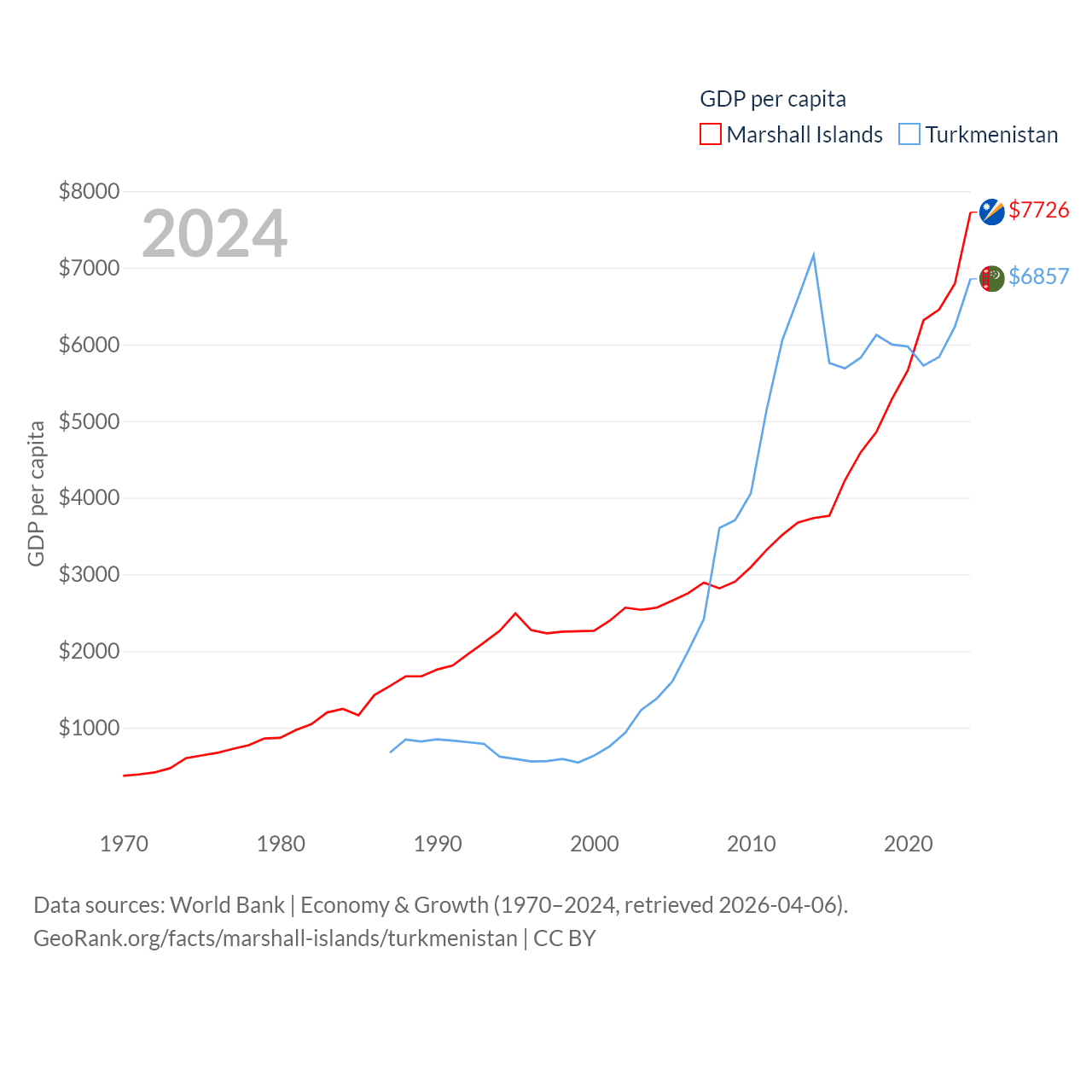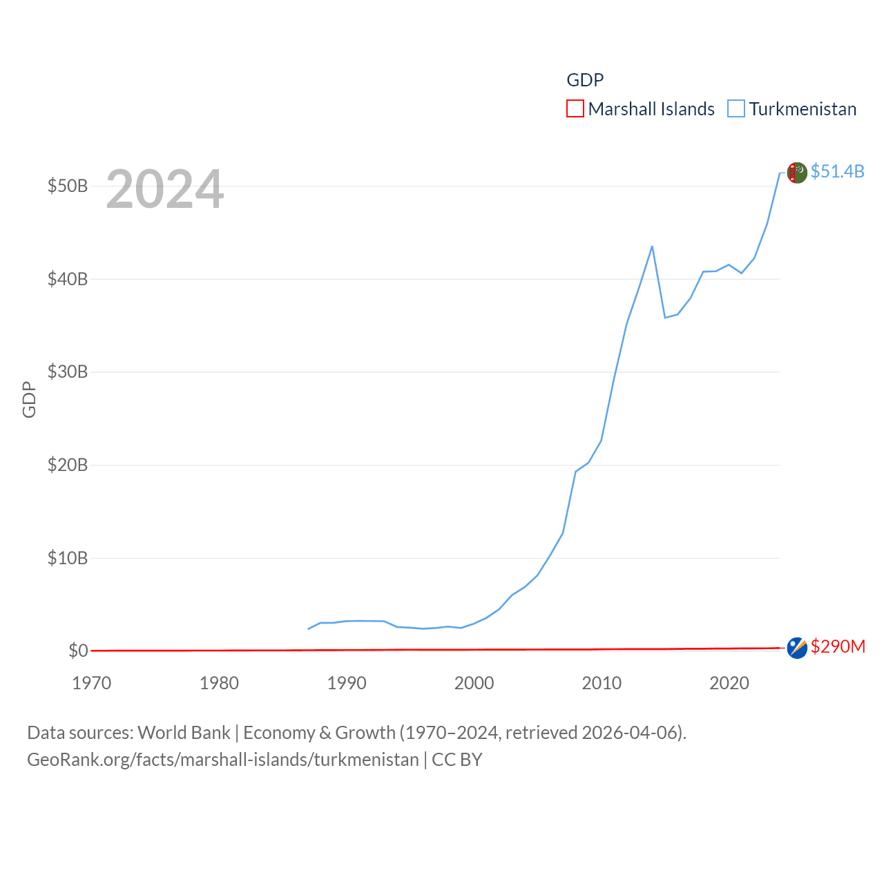 By GDP, The Marshall Islands ranks 193/197 ($290M) and Turkmenistan ranks 92/197 ($51.4B). By GDP per capita, The Marshall Islands ranks 96/197 ($7,726), while Turkmenistan ranks 104/197 ($6,857).