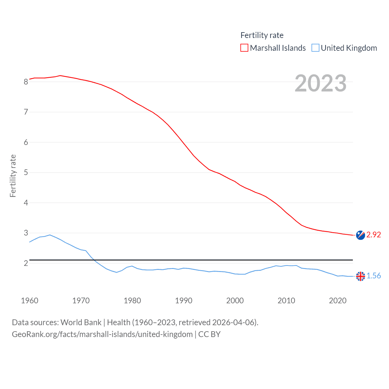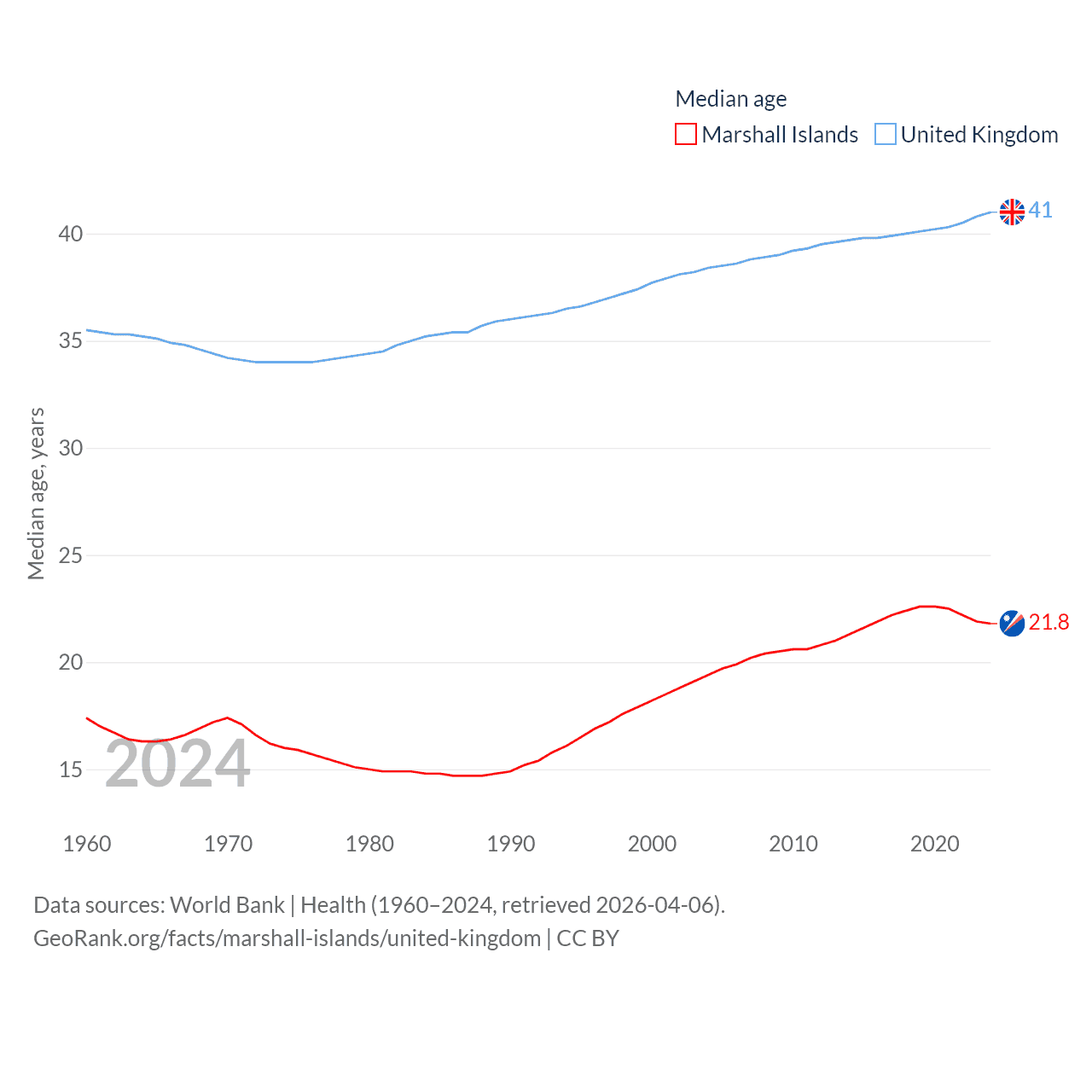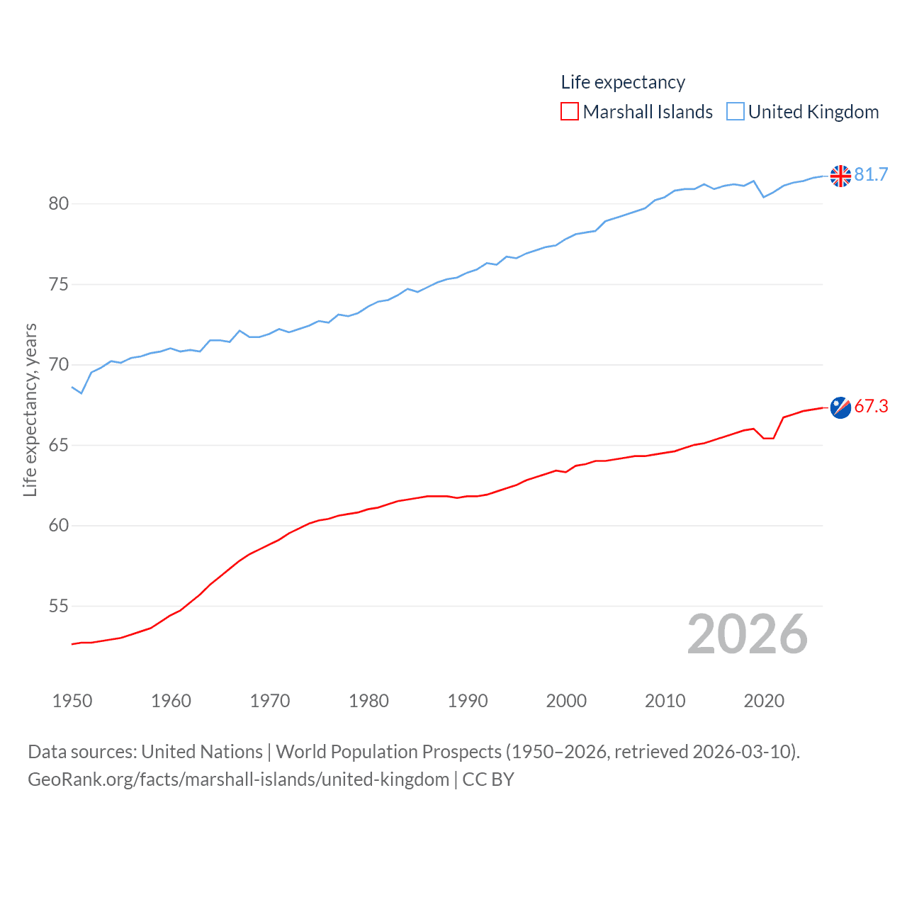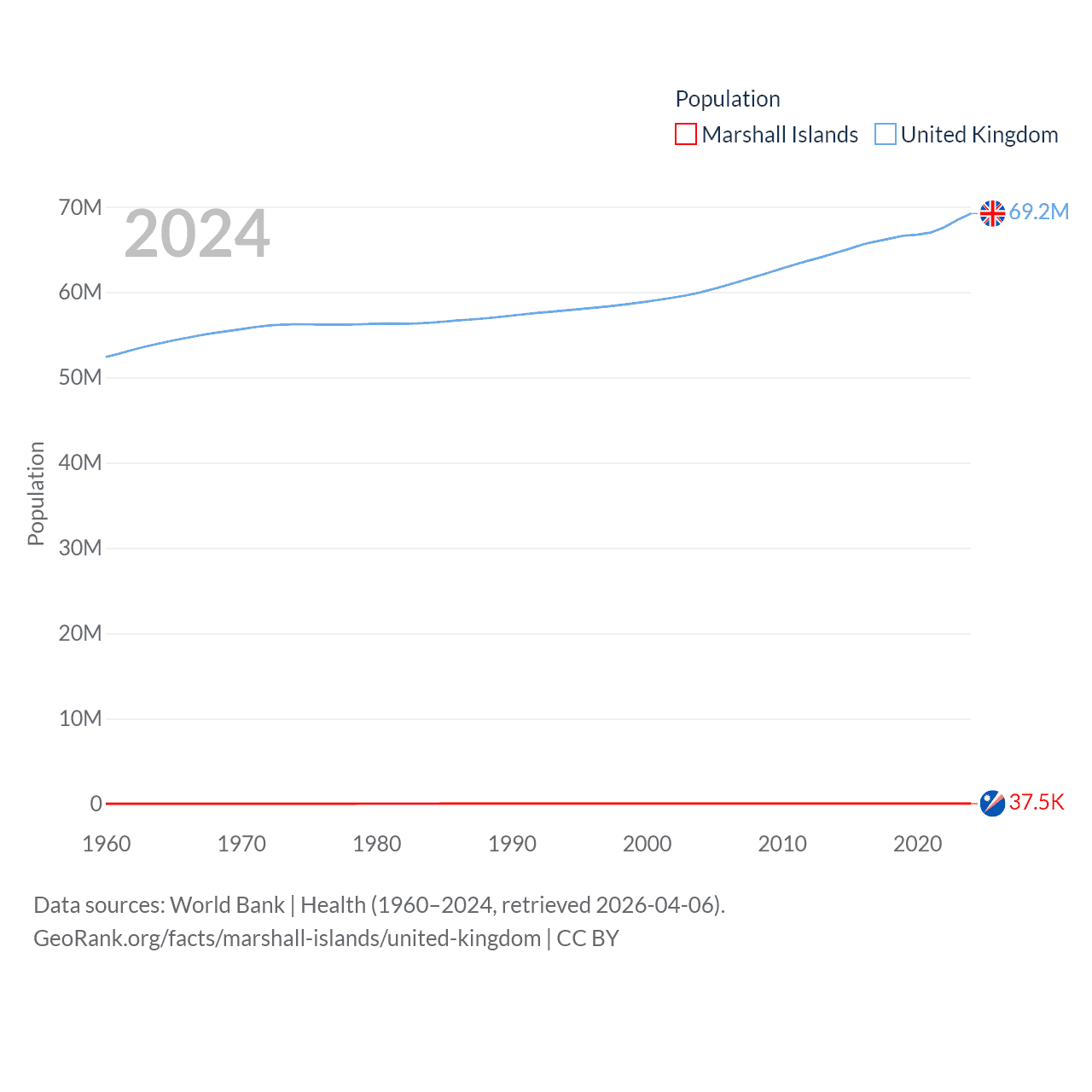 The Marshall Islands has a population of 37.5K (ranked 192/197), compared with 69.2M in The United Kingdom (ranked 21/197). The Marshall Islands' land area is 69.5 sq mi versus 93,410 sq mi for The United Kingdom (ranked 191st vs. 78th).