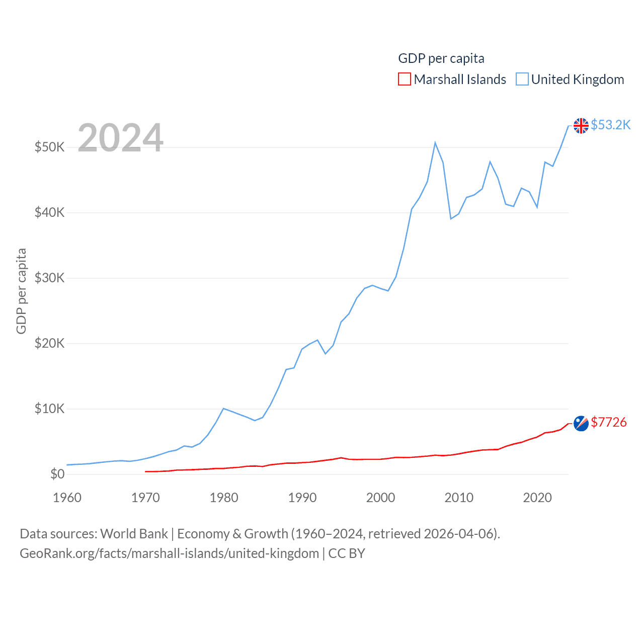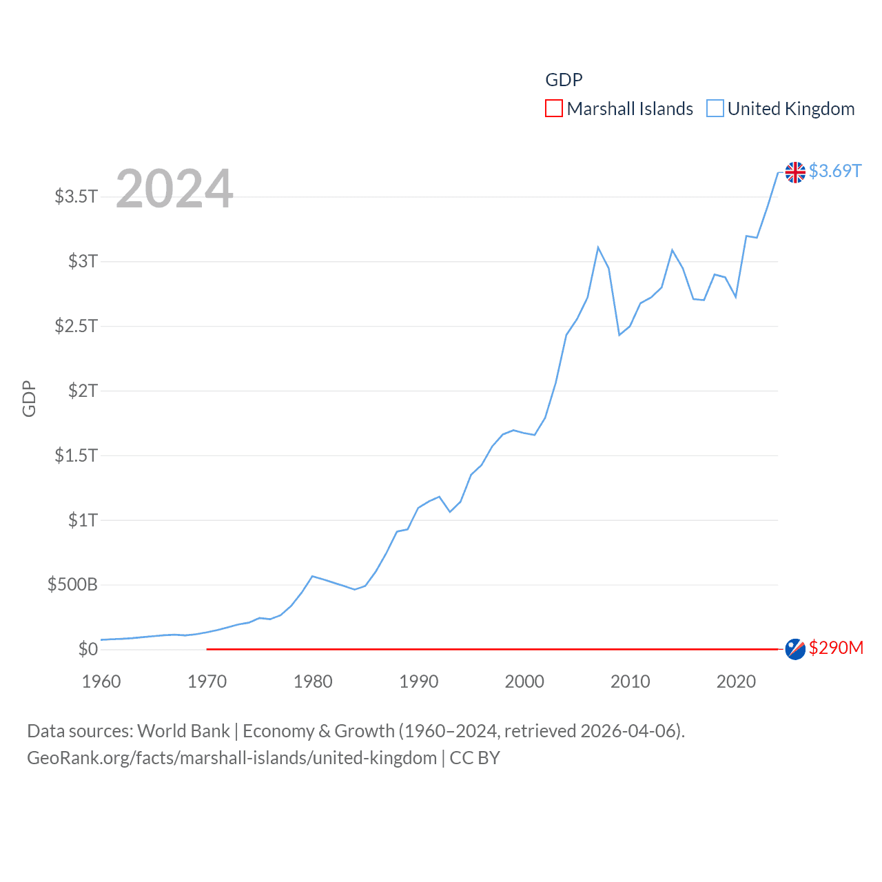 By GDP, The Marshall Islands ranks 193/197 ($290M) and The United Kingdom ranks 6/197 ($3.69T). By GDP per capita, The Marshall Islands ranks 96/197 ($7,726), while The United Kingdom ranks 22/197 ($53,246).