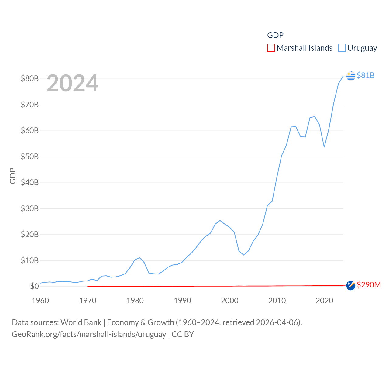 By GDP, The Marshall Islands ranks 193/197 ($290M) and Uruguay ranks 81/197 ($81B). By GDP per capita, The Marshall Islands ranks 96/197 ($7,726), while Uruguay ranks 52/197 ($23,907).