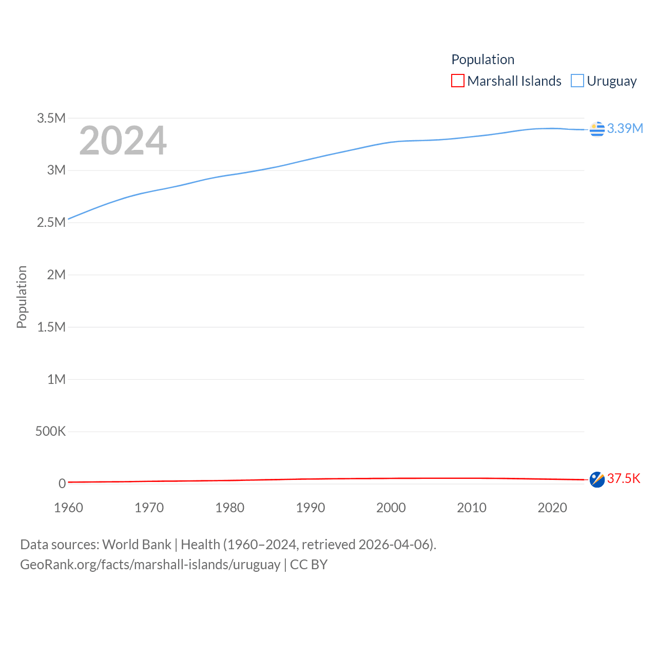 The Marshall Islands has a population of 37.5K (ranked 192/197), compared with 3.39M in Uruguay (ranked 133/197). The Marshall Islands' land area is 69.5 sq mi versus 67,576 sq mi for Uruguay (ranked 191st vs. 89th).