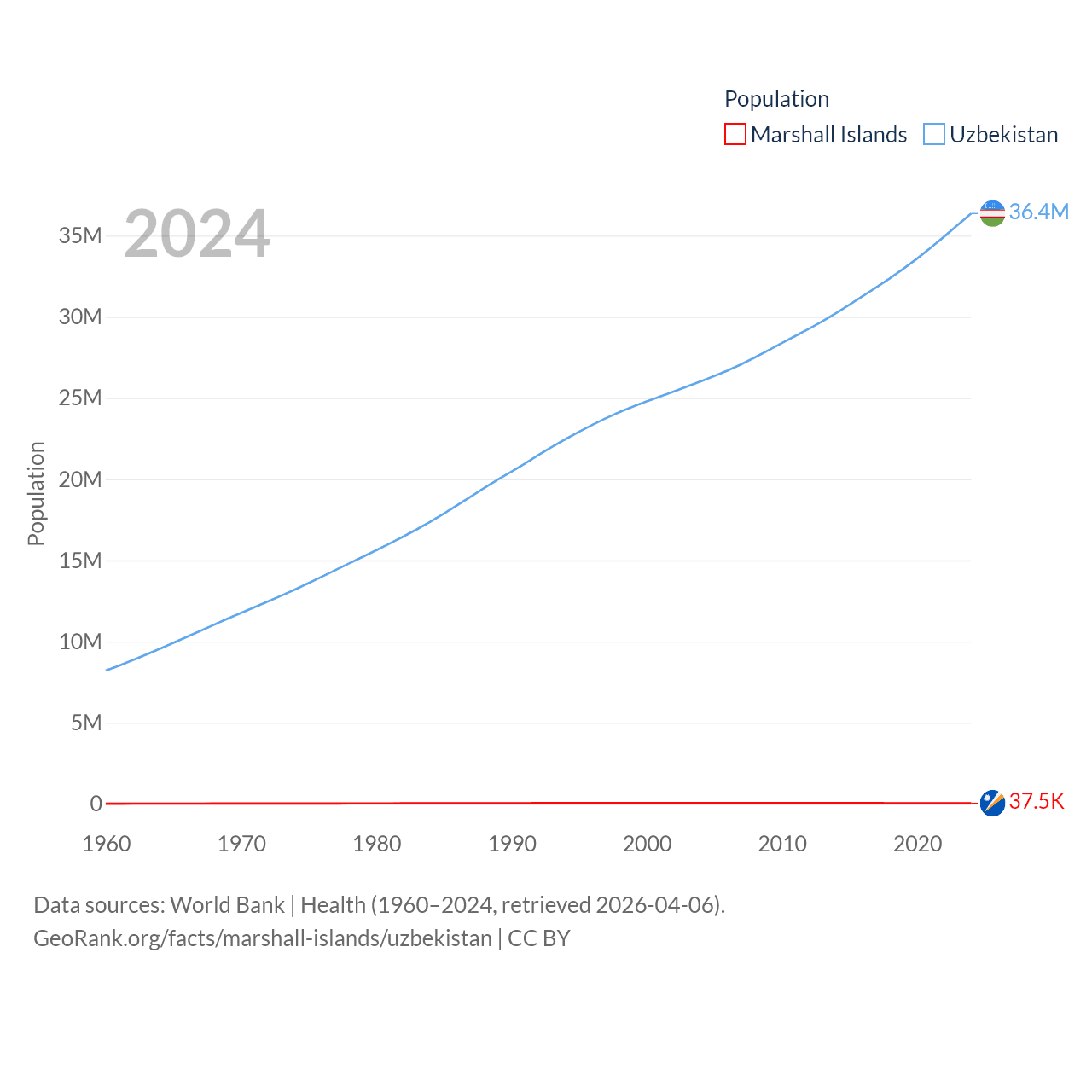 The Marshall Islands has a population of 37.5K (ranked 192/197), compared with 36.4M in Uzbekistan (ranked 43/197). The Marshall Islands' land area is 69.5 sq mi versus 170,136 sq mi for Uzbekistan (ranked 191st vs. 56th).