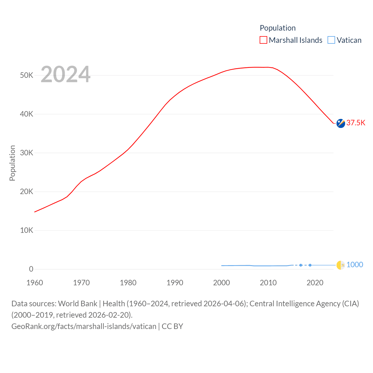 The Marshall Islands has a population of 37.5K (ranked 192/197), compared with 1K in The Vatican (ranked 197/197). The Marshall Islands' land area is 69.5 sq mi versus 0.17 sq mi for The Vatican (ranked 191st vs. 197th).