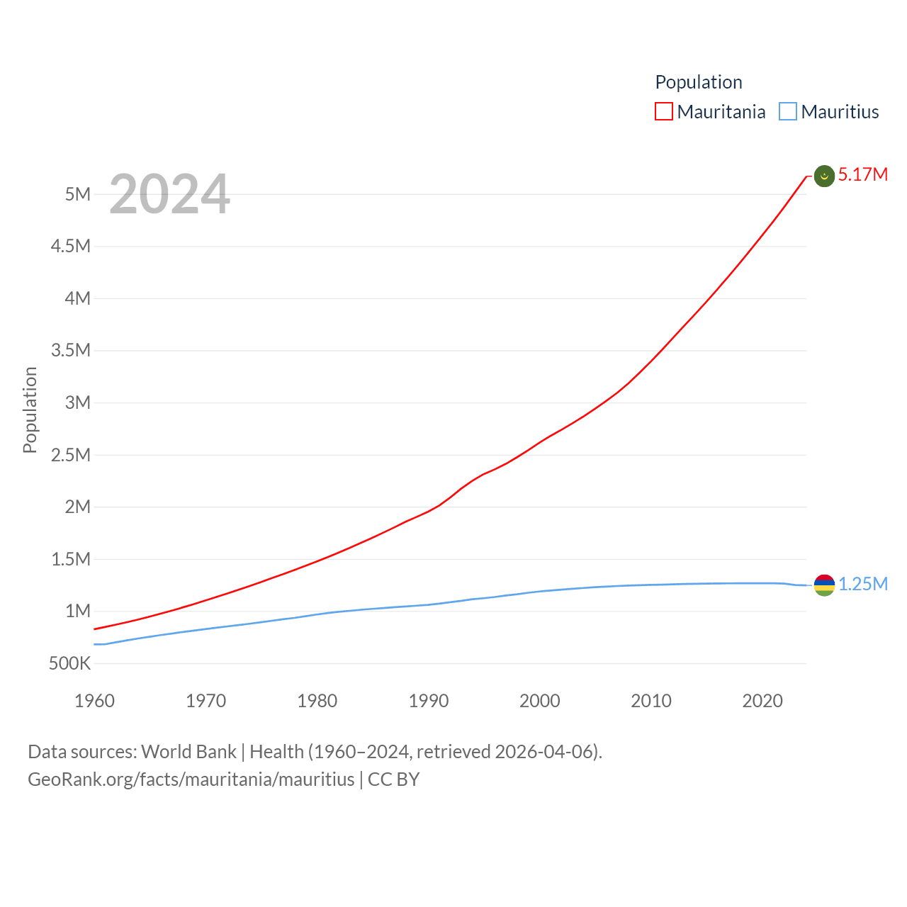 Mauritania has a population of 5.17M (ranked 125/197), compared with 1.25M in Mauritius (ranked 156/197). Mauritania's land area is 397,955 sq mi versus 771 sq mi for Mauritius (ranked 28th vs. 170th).