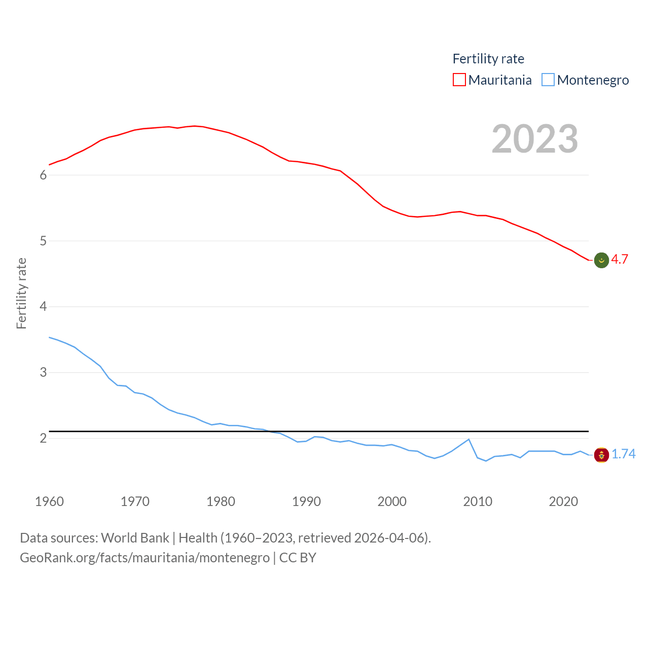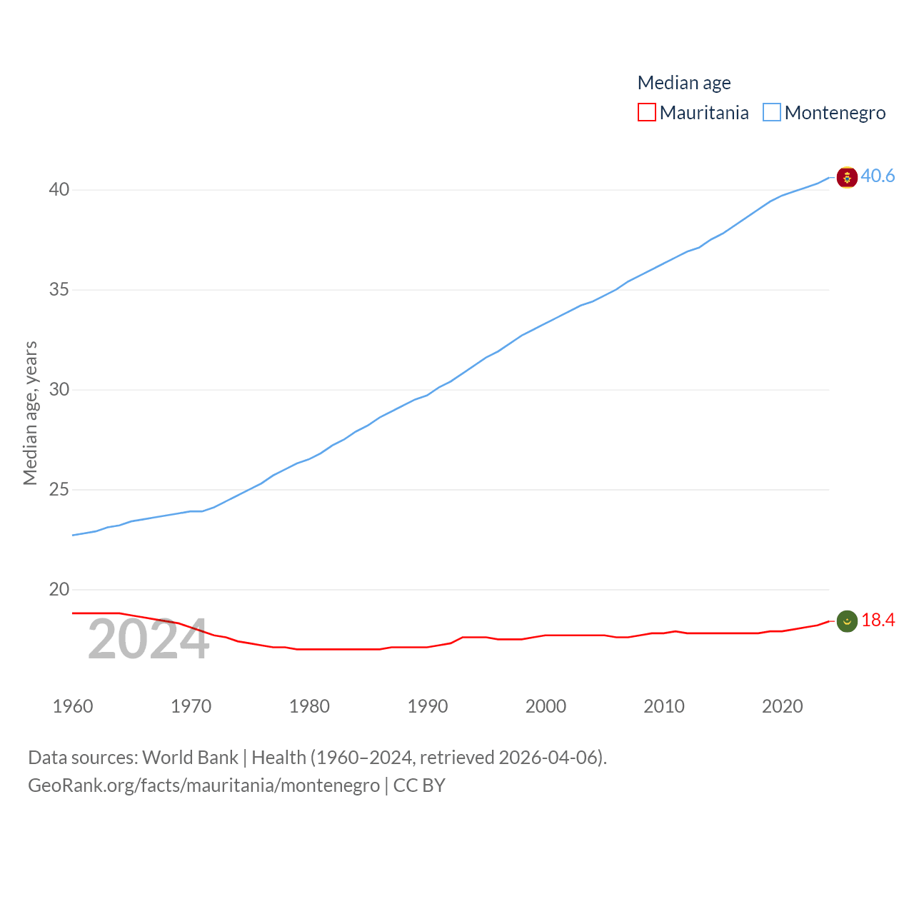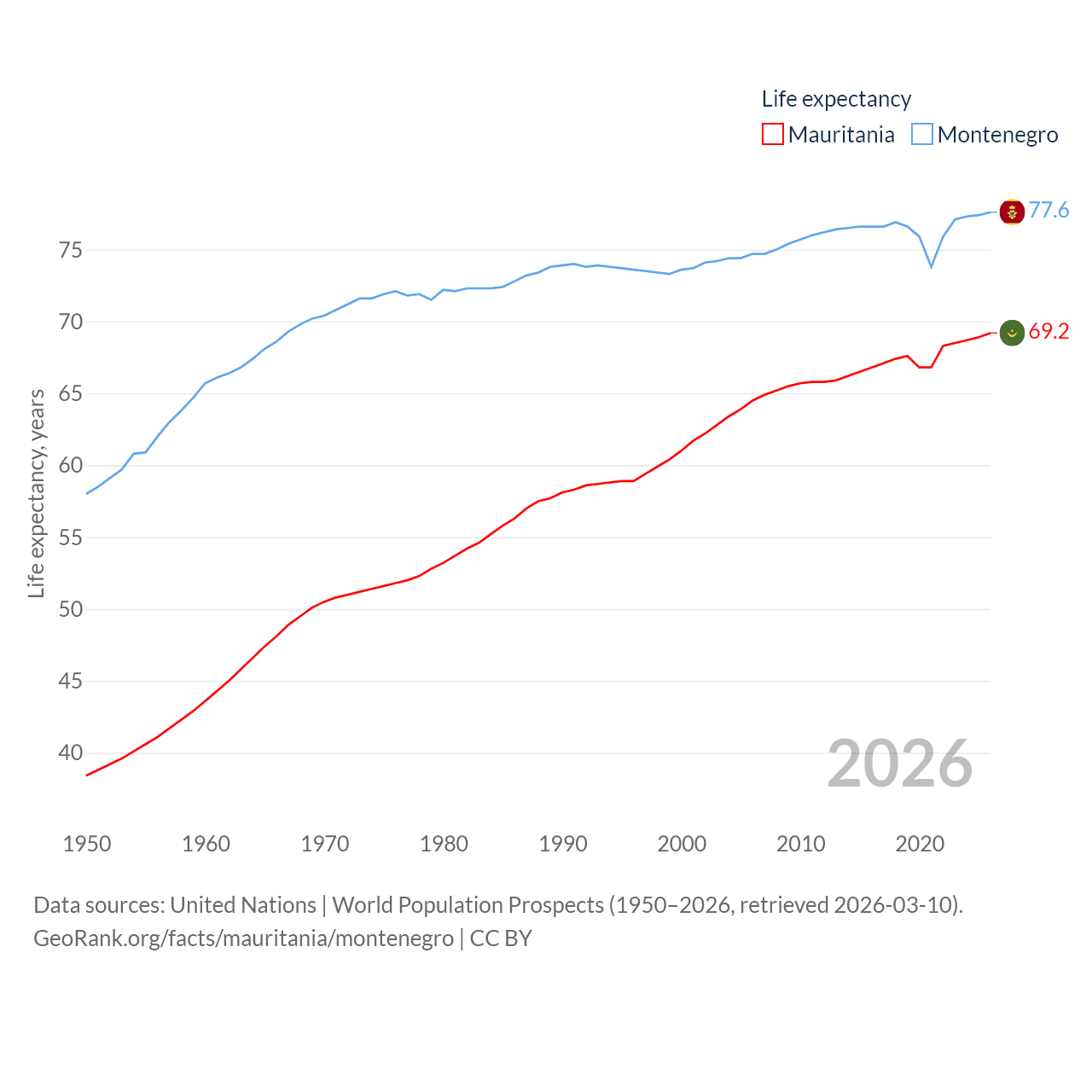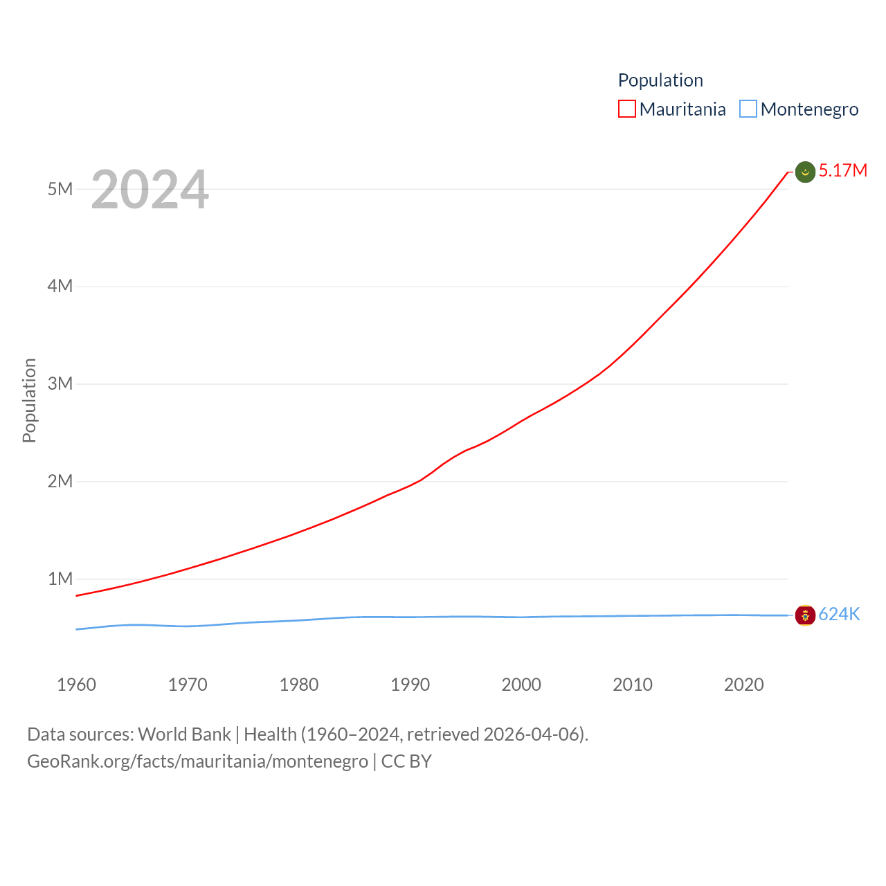 Mauritania has a population of 5.17M (ranked 125/197), compared with 624K in Montenegro (ranked 166/197). Mauritania's land area is 397,955 sq mi versus 5,193 sq mi for Montenegro (ranked 28th vs. 156th).