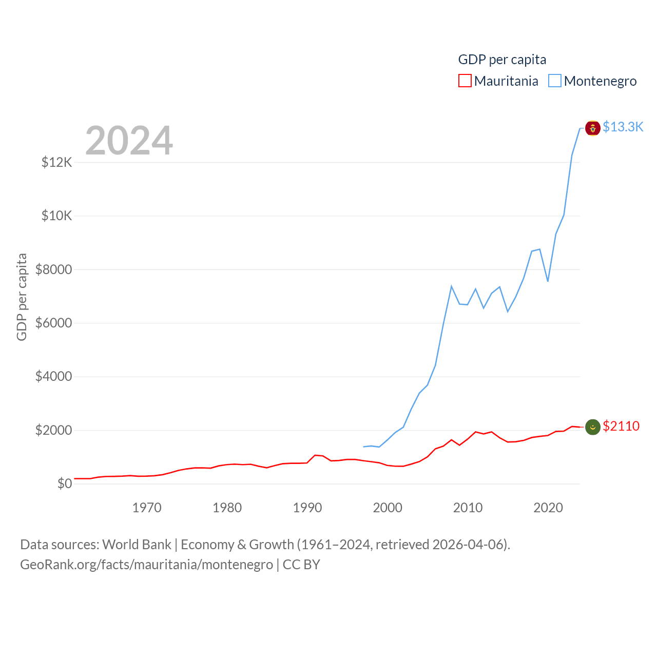 By GDP, Mauritania ranks 153/197 ($10.9B) and Montenegro ranks 155/197 ($8.27B). By GDP per capita, Mauritania ranks 156/197 ($2,110), while Montenegro ranks 77/197 ($13,263).