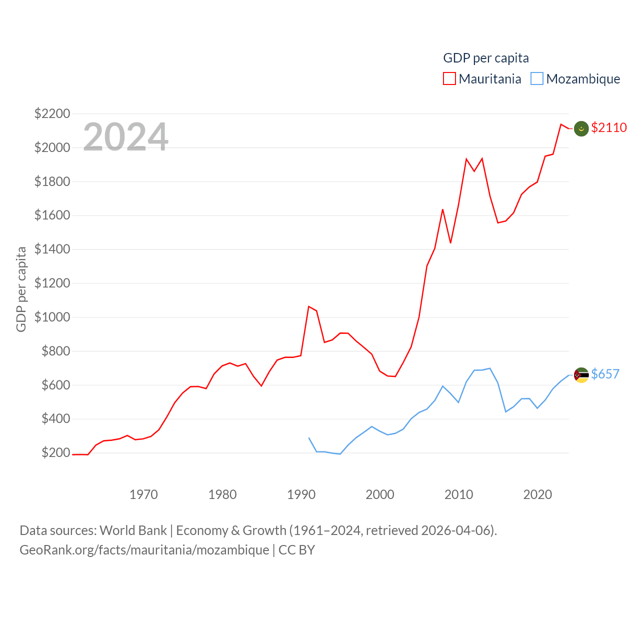 By GDP, Mauritania ranks 153/197 ($10.9B) and Mozambique ranks 123/197 ($22.7B). By GDP per capita, Mauritania ranks 156/197 ($2,110), while Mozambique ranks 189/197 ($657).