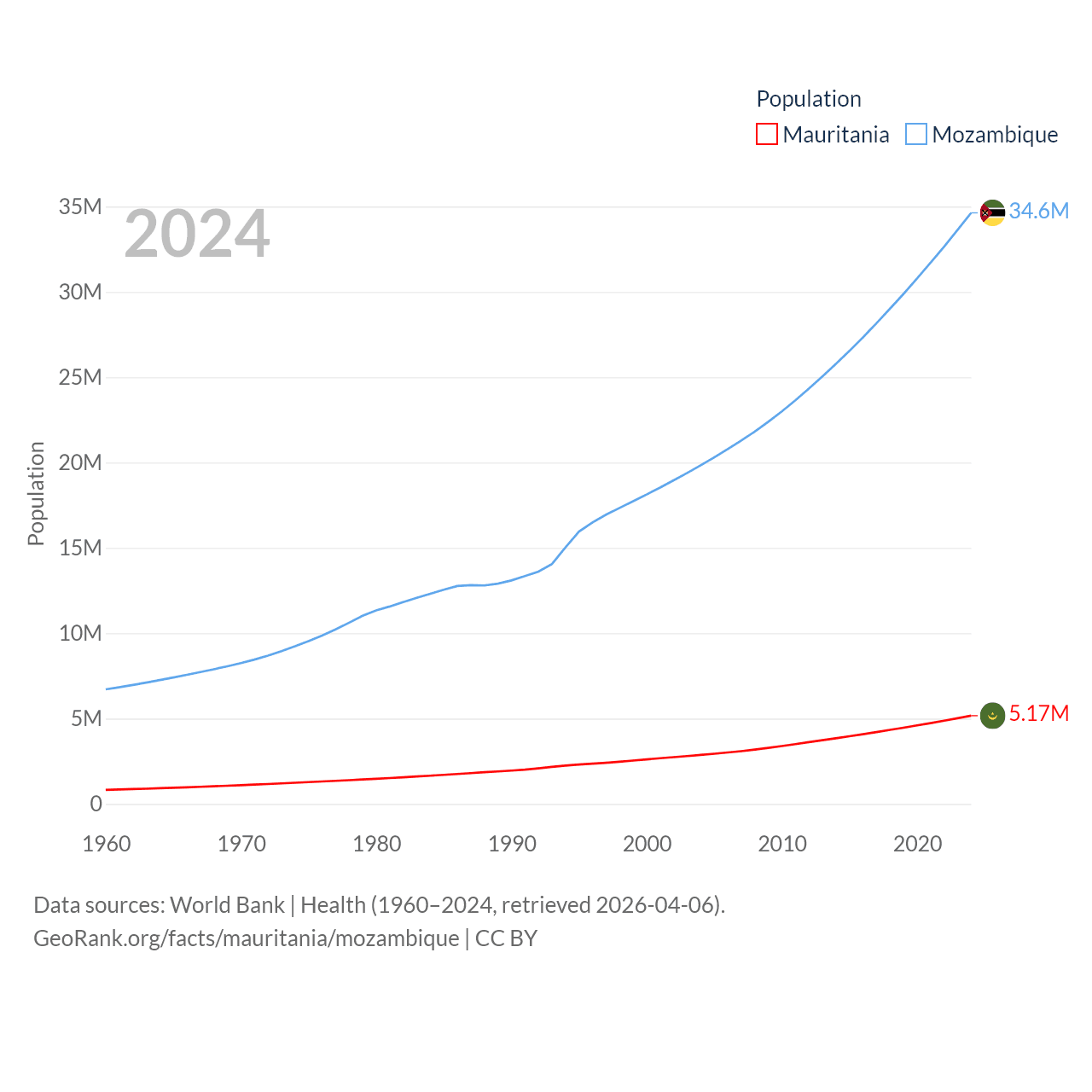 Mauritania has a population of 5.17M (ranked 125/197), compared with 34.6M in Mozambique (ranked 46/197). Mauritania's land area is 397,955 sq mi versus 303,623 sq mi for Mozambique (ranked 28th vs. 34th).