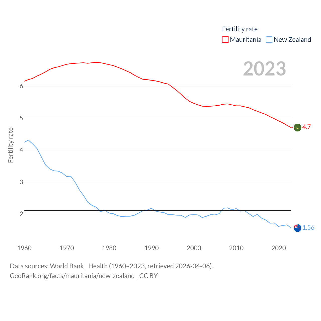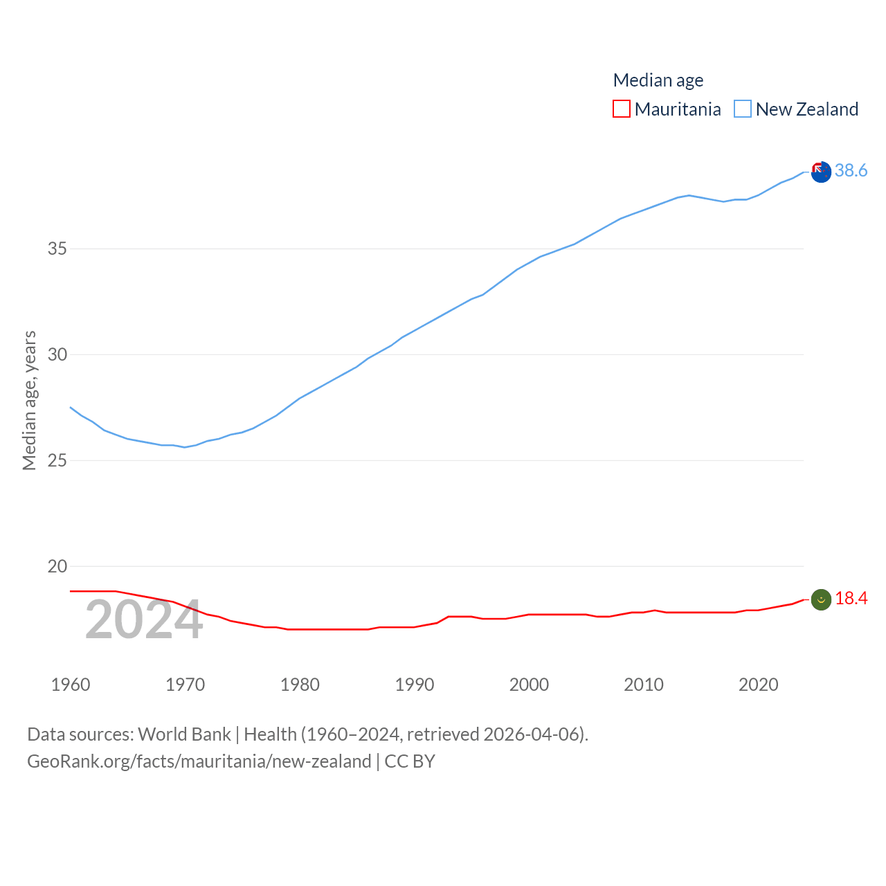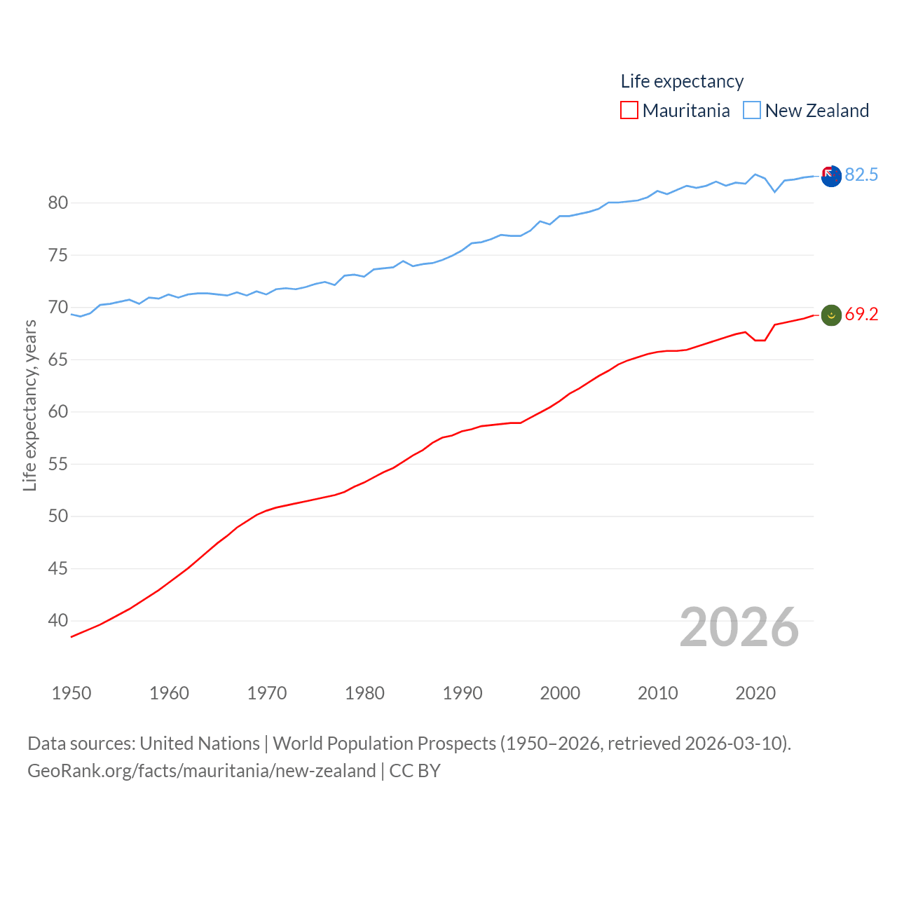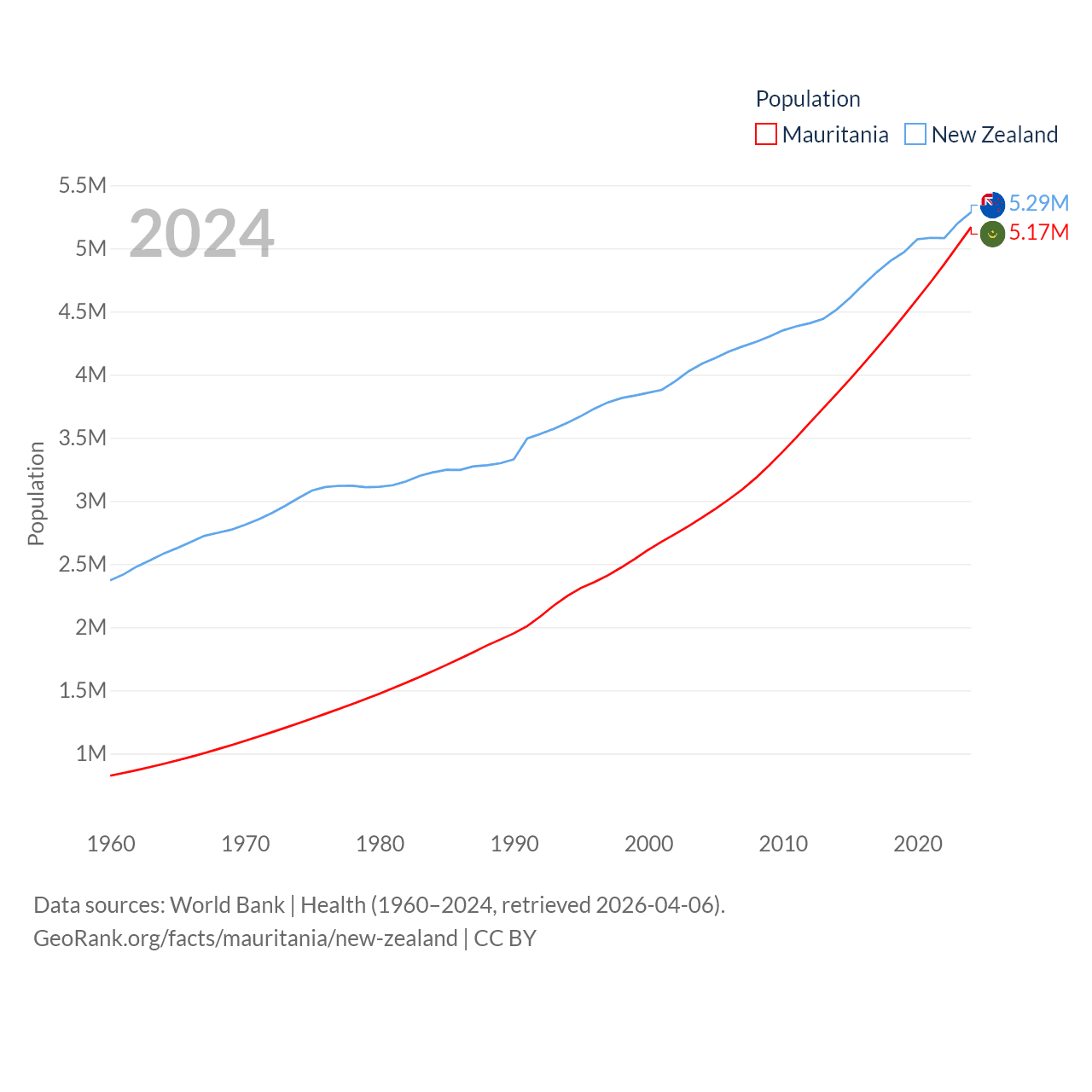 Mauritania has a population of 5.17M (ranked 125/197), compared with 5.29M in New Zealand (ranked 123/197). Mauritania's land area is 397,955 sq mi versus 101,665 sq mi for New Zealand (ranked 28th vs. 74th).