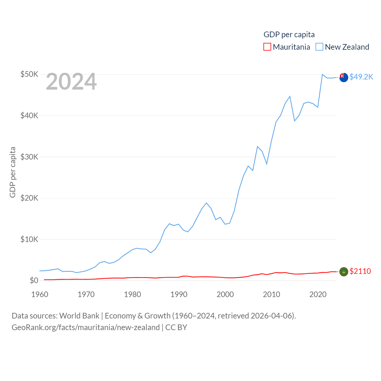 By GDP, Mauritania ranks 153/197 ($10.9B) and New Zealand ranks 52/197 ($260B). By GDP per capita, Mauritania ranks 156/197 ($2,110), while New Zealand ranks 26/197 ($49,205).