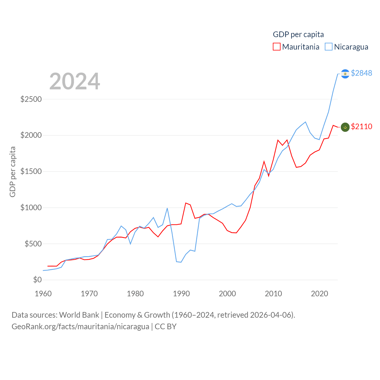 By GDP, Mauritania ranks 153/197 ($10.9B) and Nicaragua ranks 131/197 ($19.7B). By GDP per capita, Mauritania ranks 156/197 ($2,110), while Nicaragua ranks 141/197 ($2,848).