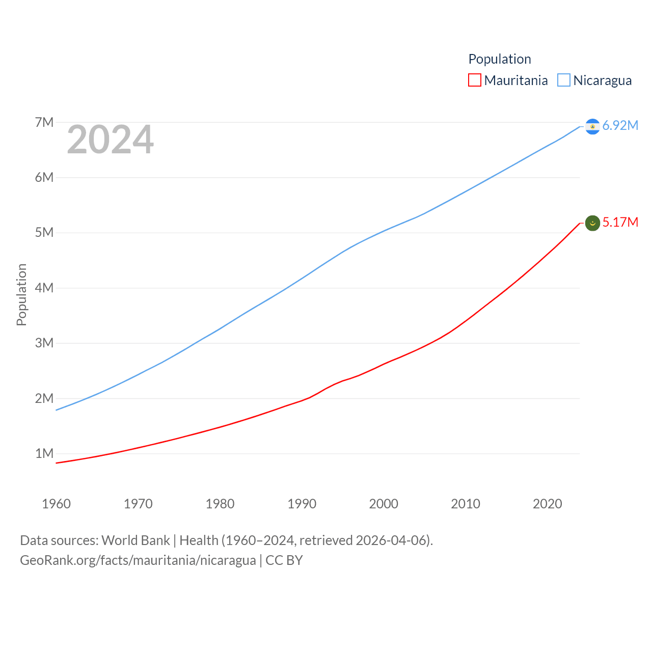 Mauritania has a population of 5.17M (ranked 125/197), compared with 6.92M in Nicaragua (ranked 108/197). Mauritania's land area is 397,955 sq mi versus 46,464 sq mi for Nicaragua (ranked 28th vs. 98th).
