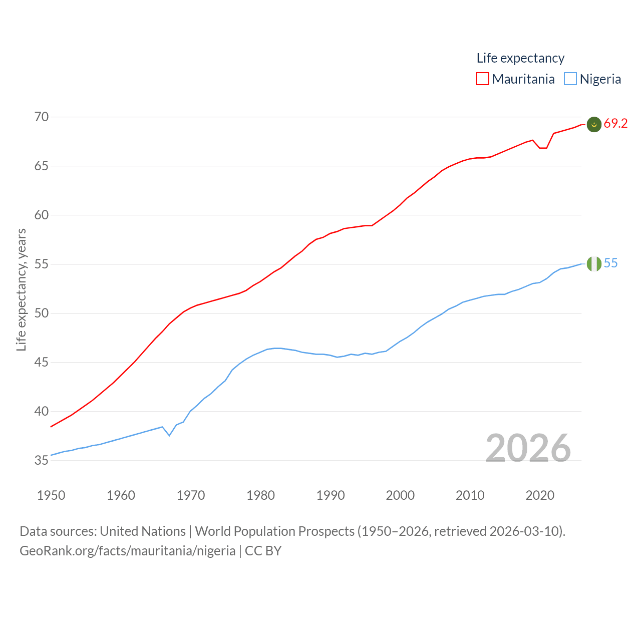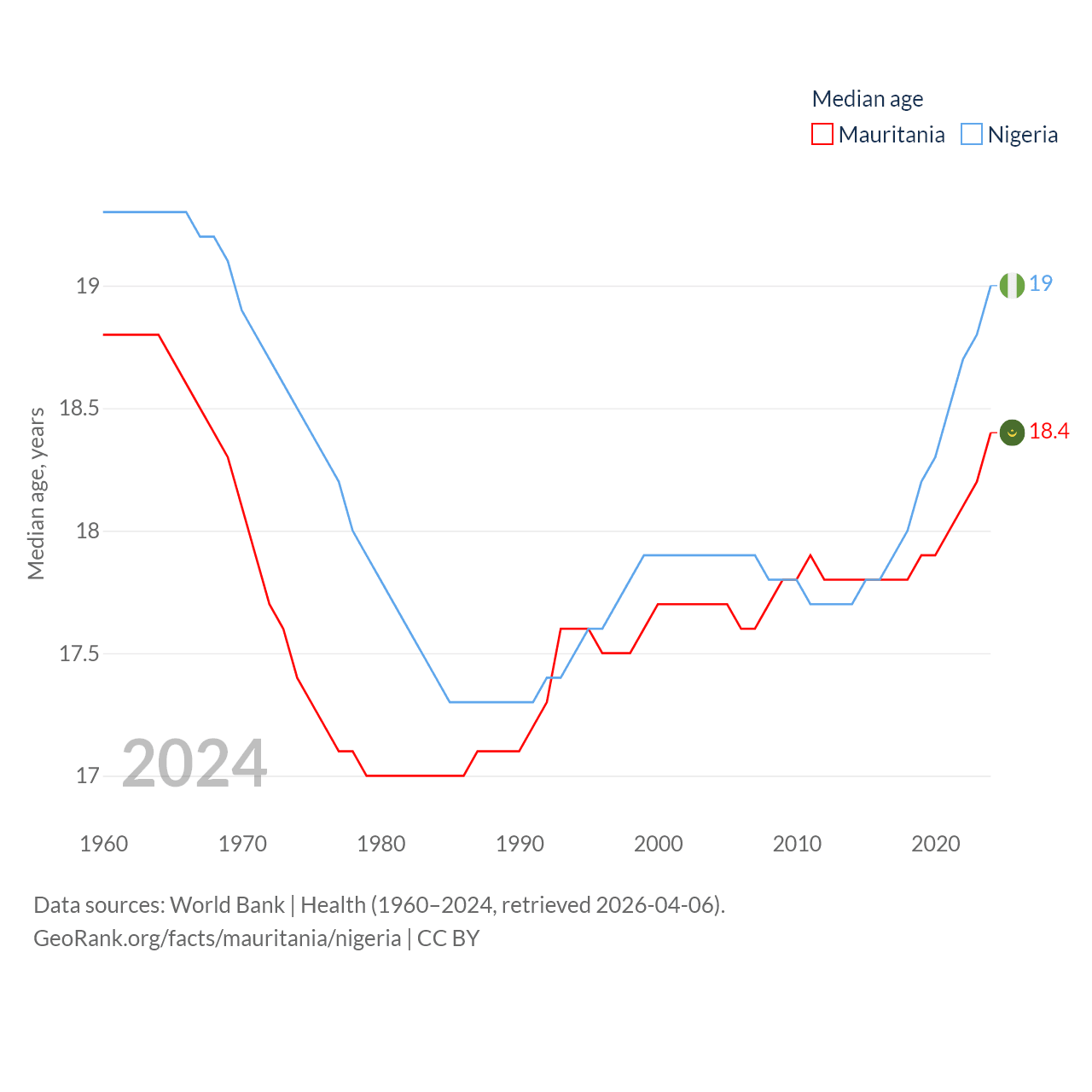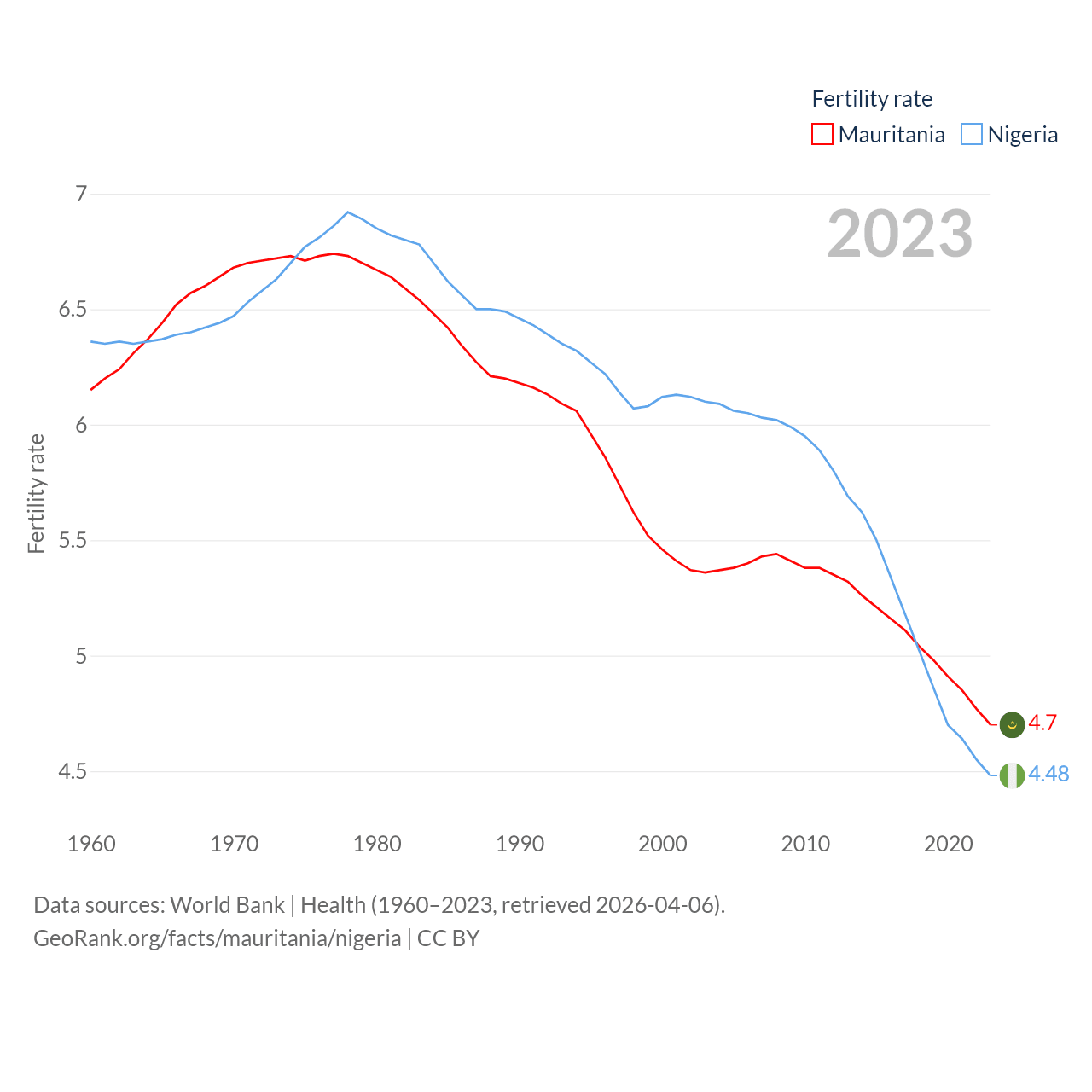 Mauritania has a population of 5.17M (ranked 125/197), compared with 233M in Nigeria (ranked 6/197). Mauritania's land area is 397,955 sq mi versus 351,650 sq mi for Nigeria (ranked 28th vs. 30th).