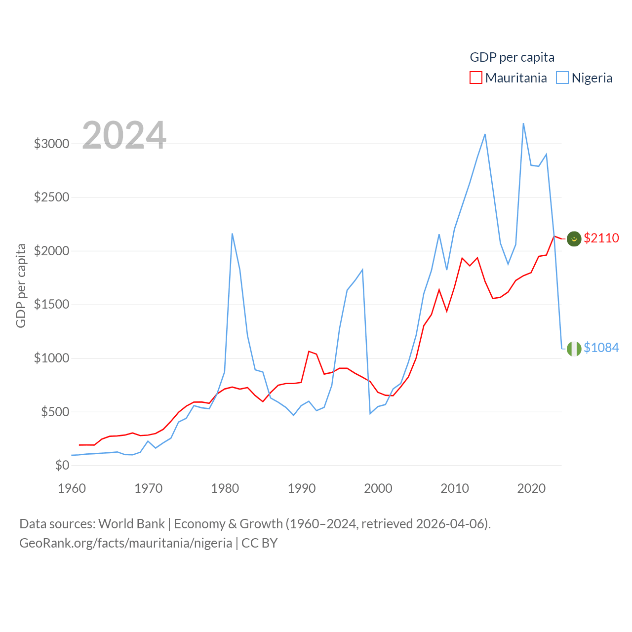 By GDP, Mauritania ranks 153/197 ($10.9B) and Nigeria ranks 54/197 ($252B). By GDP per capita, Mauritania ranks 156/197 ($2,110), while Nigeria ranks 174/197 ($1,084).