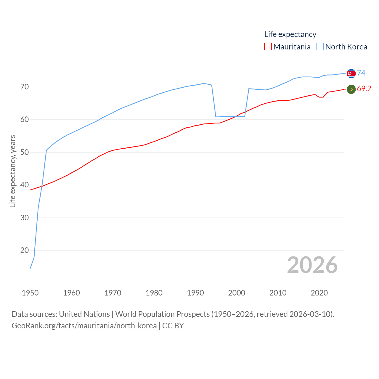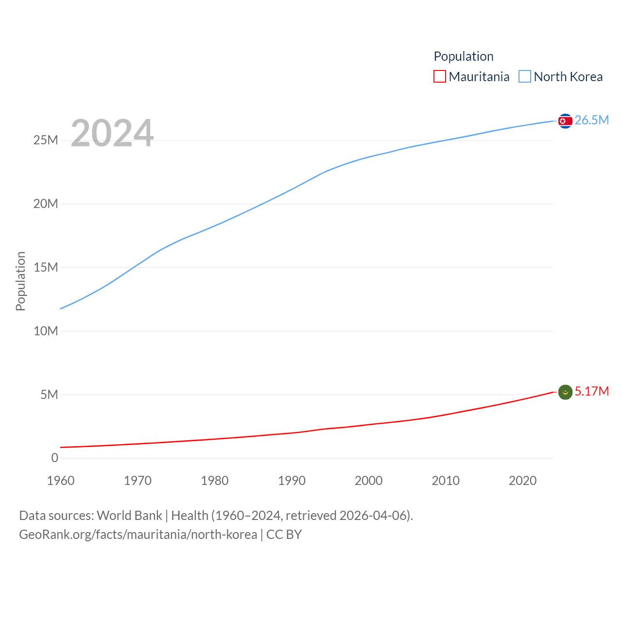 Mauritania has a population of 5.17M (ranked 125/197), compared with 26.5M in North Korea (ranked 56/197). Mauritania's land area is 397,955 sq mi versus 46,491 sq mi for North Korea (ranked 28th vs. 97th).