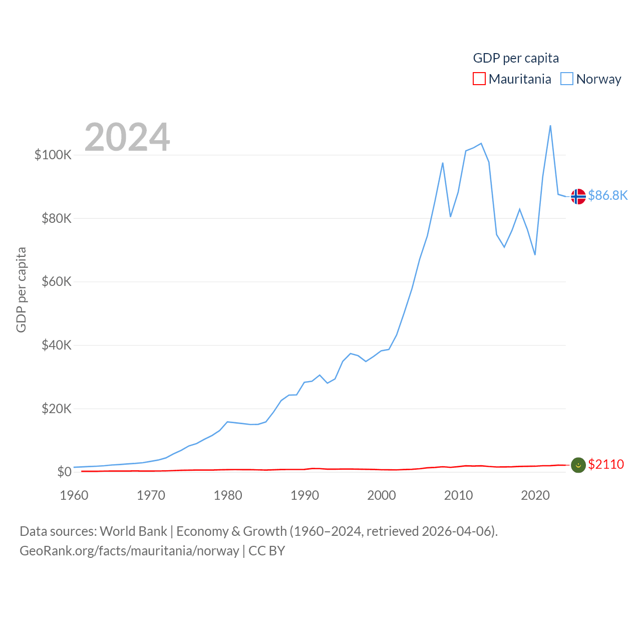 By GDP, Mauritania ranks 153/197 ($10.9B) and Norway ranks 32/197 ($484B). By GDP per capita, Mauritania ranks 156/197 ($2,110), while Norway ranks 8/197 ($86,785).