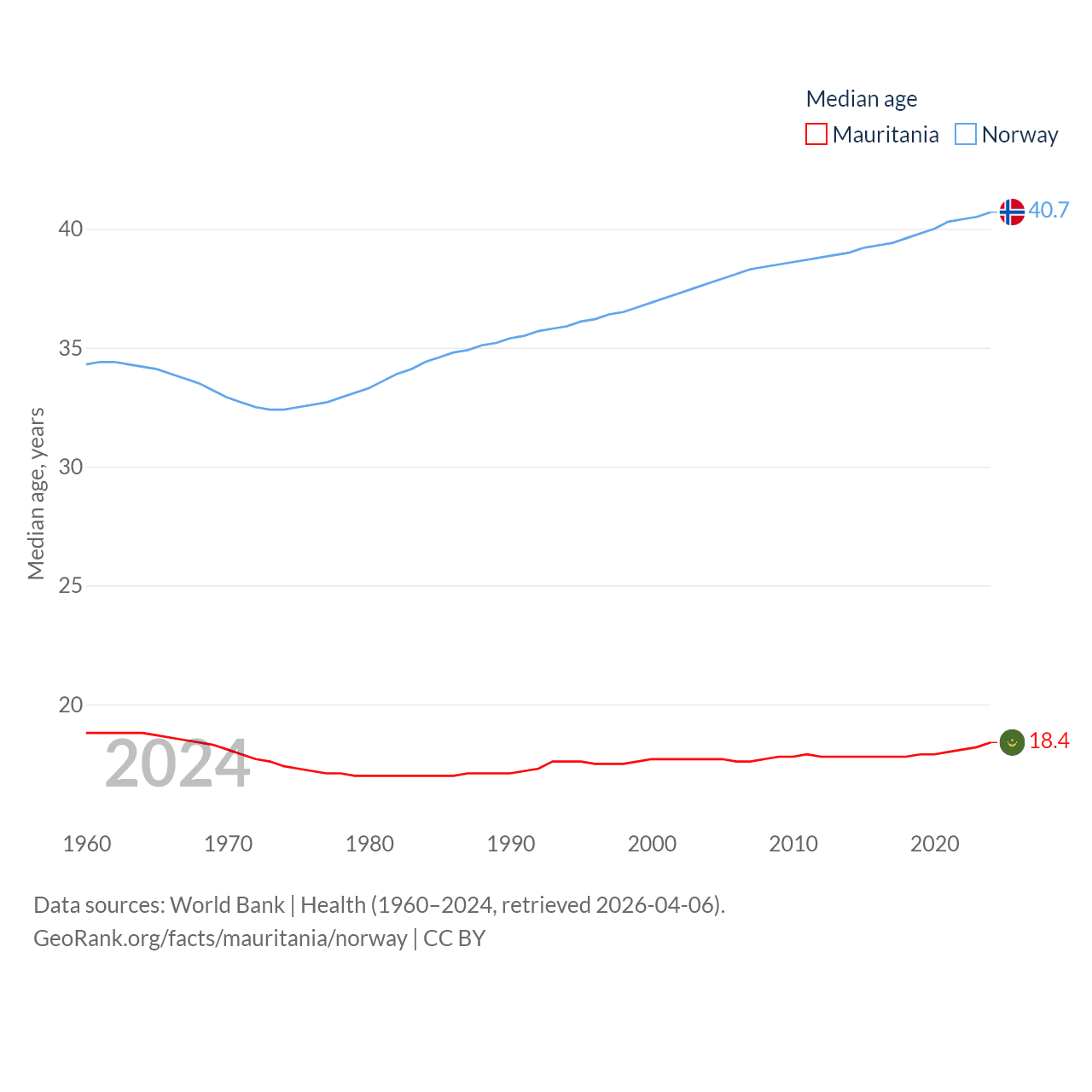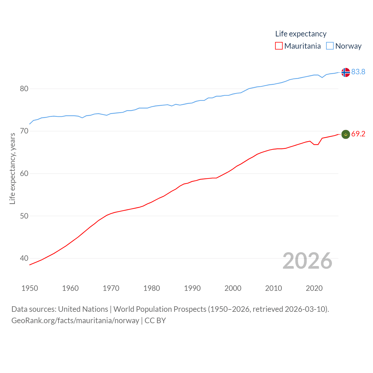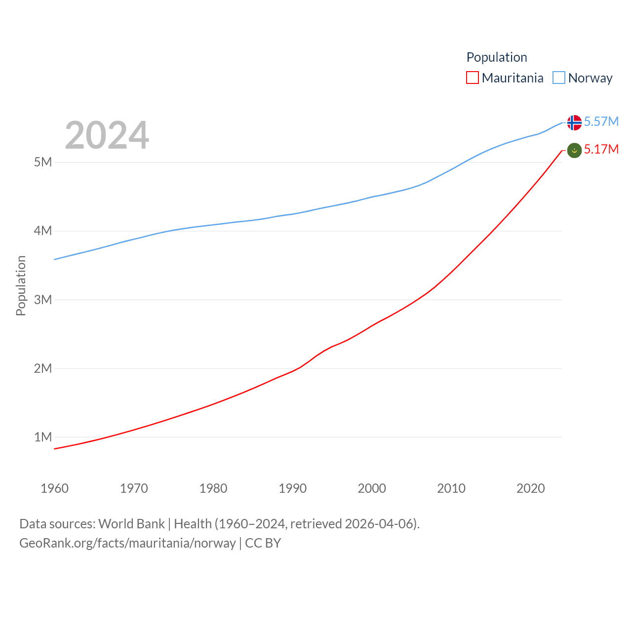 Mauritania has a population of 5.17M (ranked 125/197), compared with 5.57M in Norway (ranked 118/197). Mauritania's land area is 397,955 sq mi versus 140,645 sq mi for Norway (ranked 28th vs. 62nd).