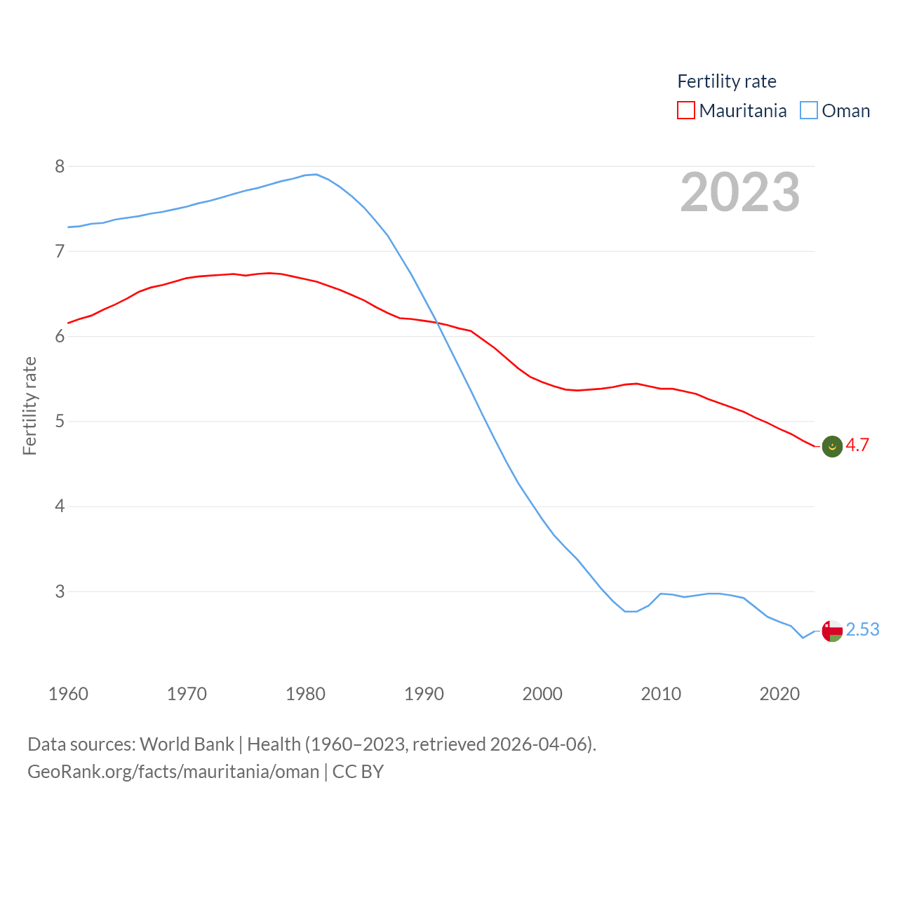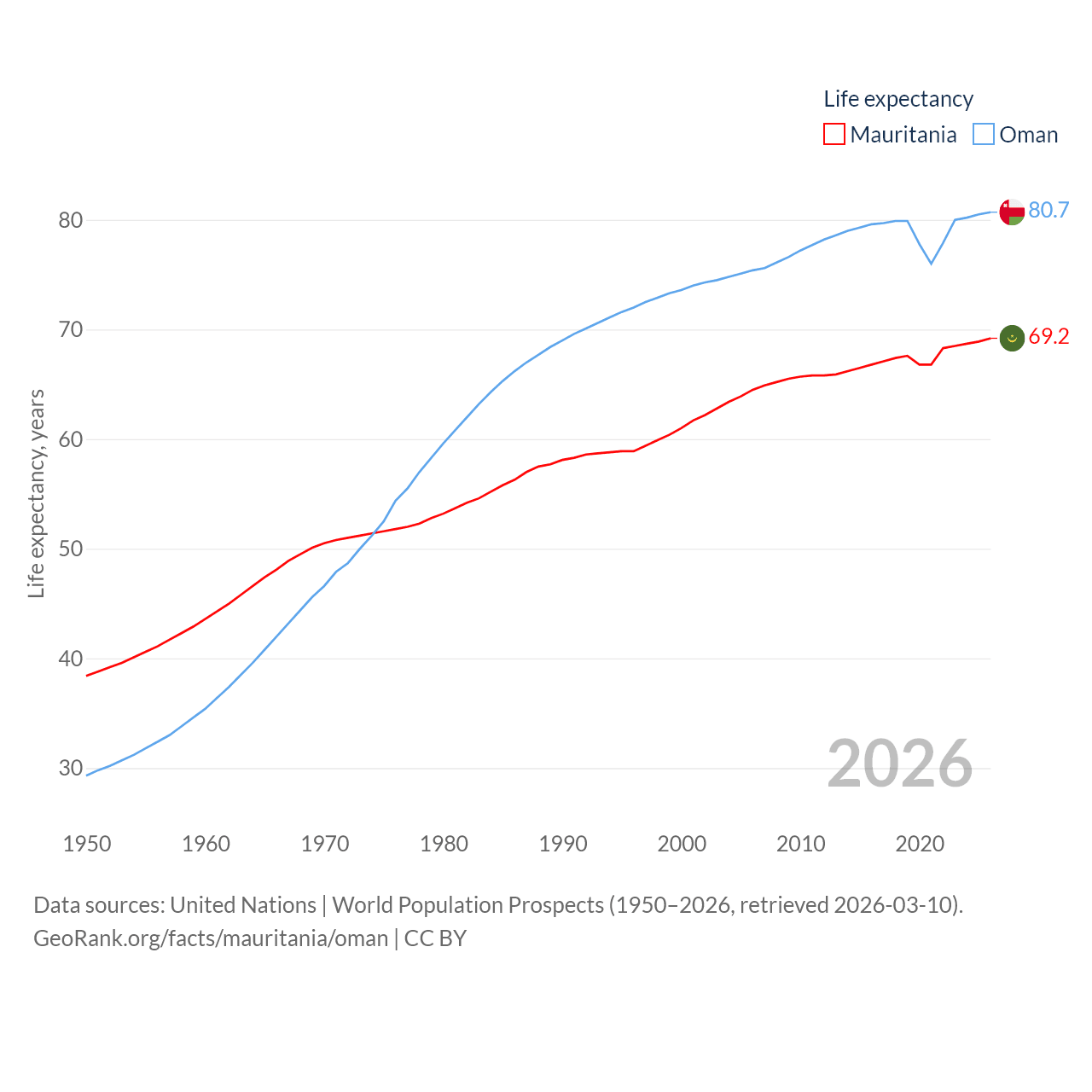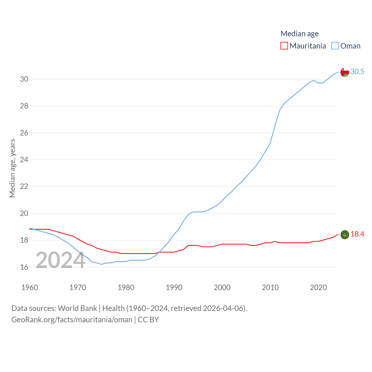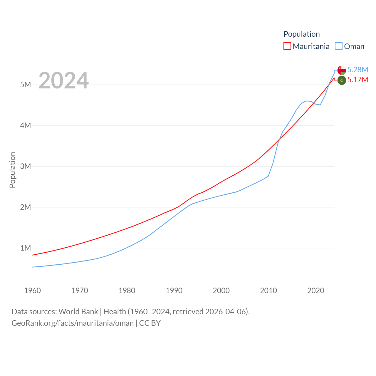 Mauritania has a population of 5.17M (ranked 125/197), compared with 5.28M in Oman (ranked 124/197). Mauritania's land area is 397,955 sq mi versus 119,499 sq mi for Oman (ranked 28th vs. 68th).