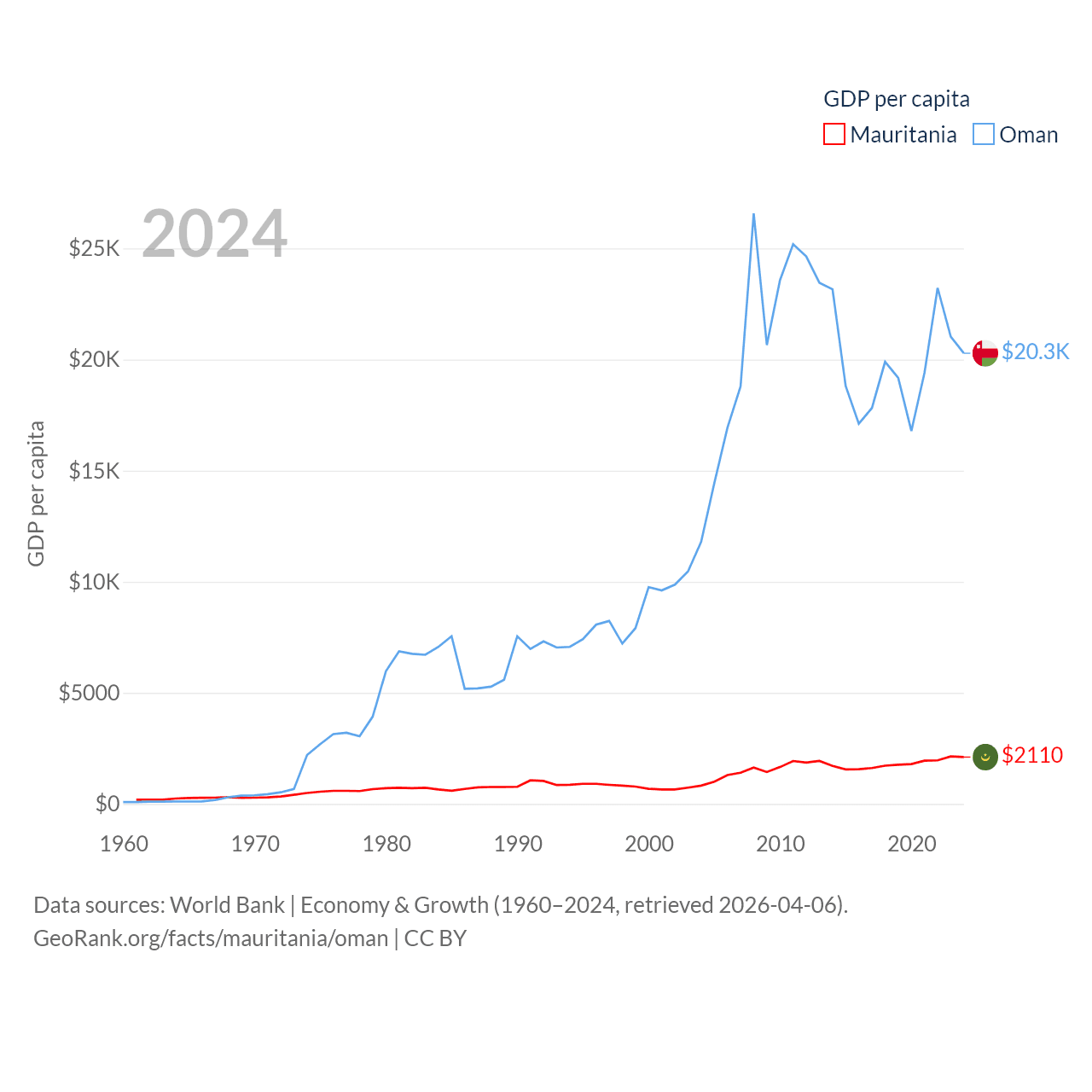 By GDP, Mauritania ranks 153/197 ($10.9B) and Oman ranks 70/197 ($107B). By GDP per capita, Mauritania ranks 156/197 ($2,110), while Oman ranks 57/197 ($20,285).