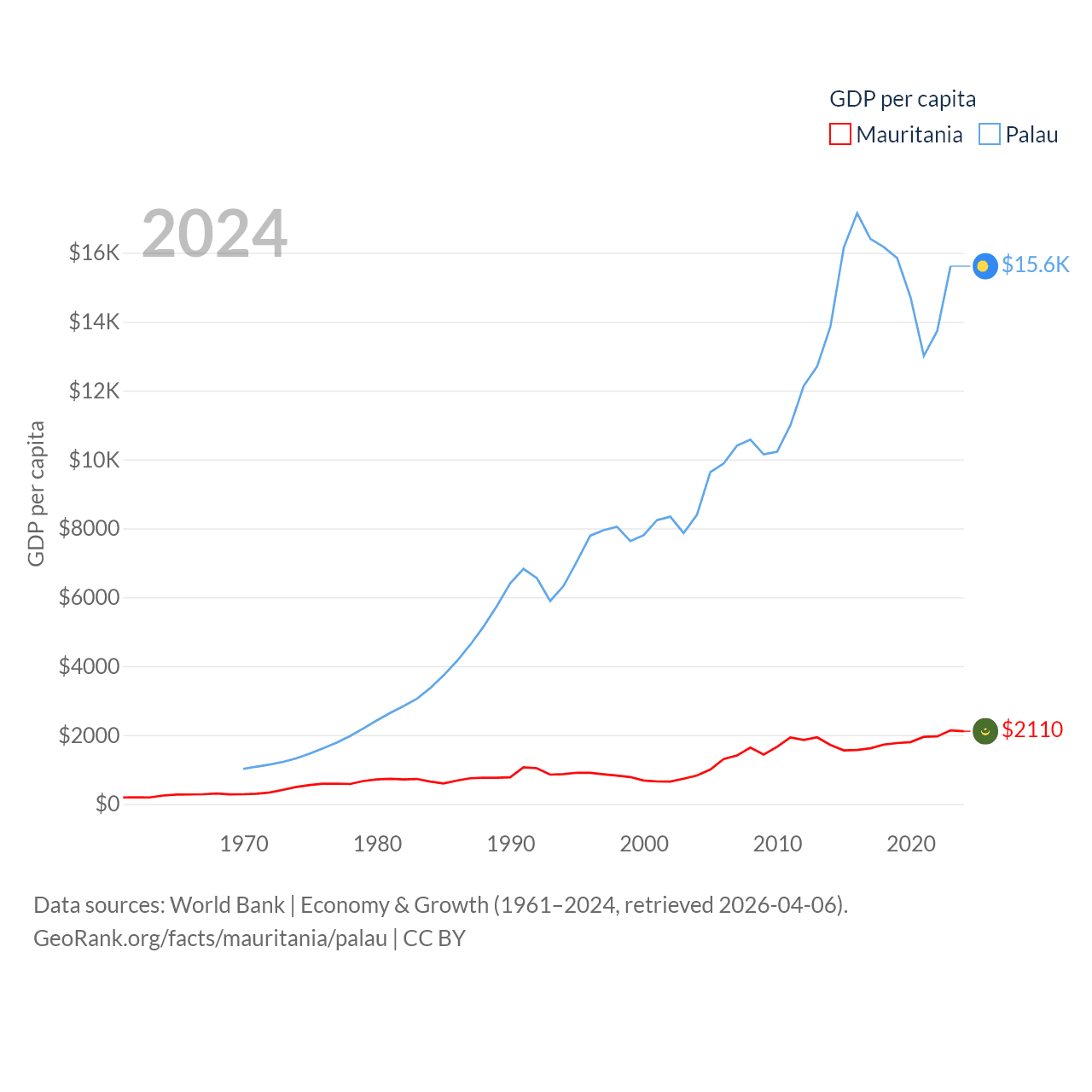 By GDP, Mauritania ranks 153/197 ($10.9B) and Palau ranks 194/197 ($277M). By GDP per capita, Mauritania ranks 156/197 ($2,110), while Palau ranks 67/197 ($15,611).