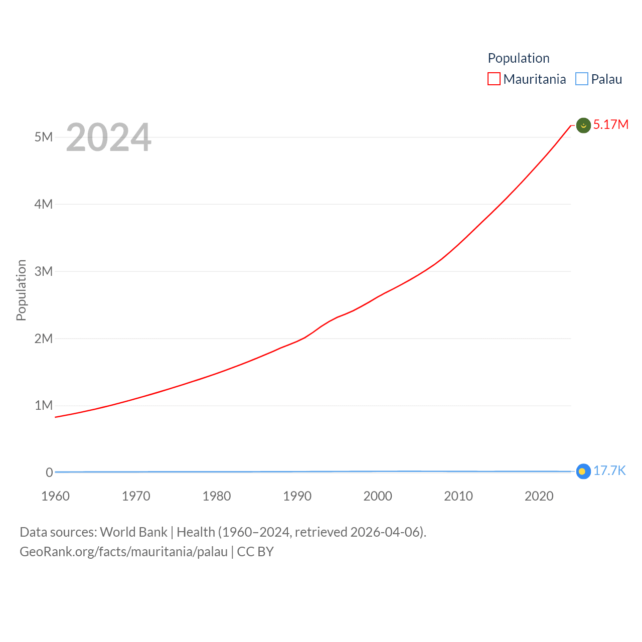 Mauritania has a population of 5.17M (ranked 125/197), compared with 17.7K in Palau (ranked 194/197). Mauritania's land area is 397,955 sq mi versus 177.6 sq mi for Palau (ranked 28th vs. 180th).