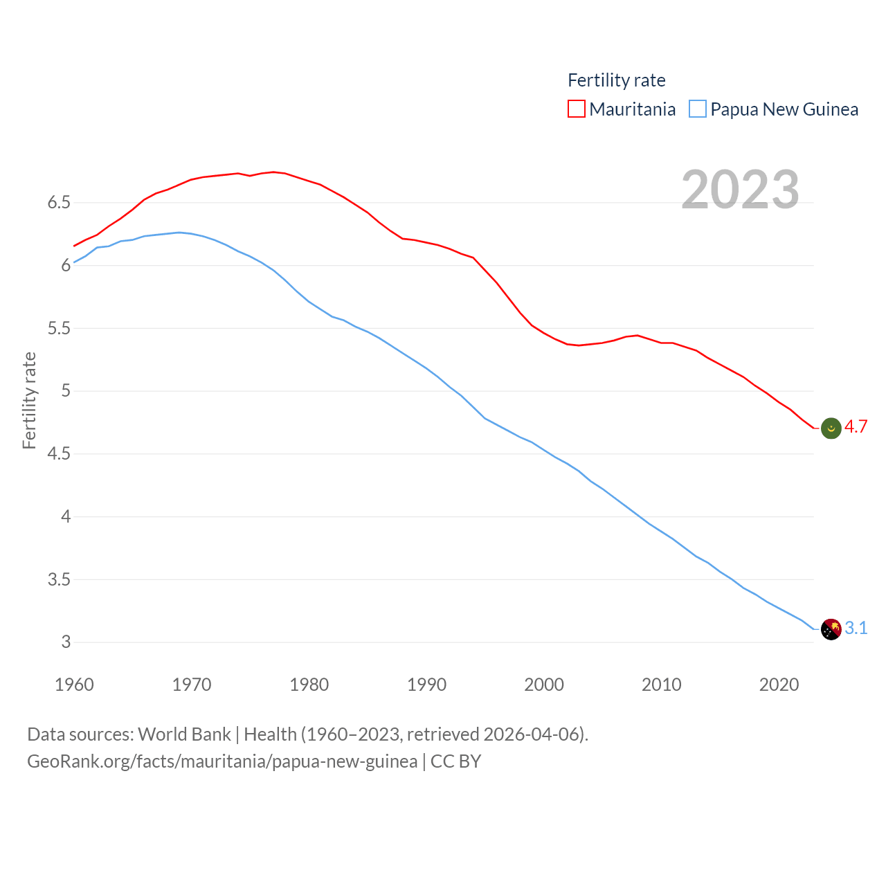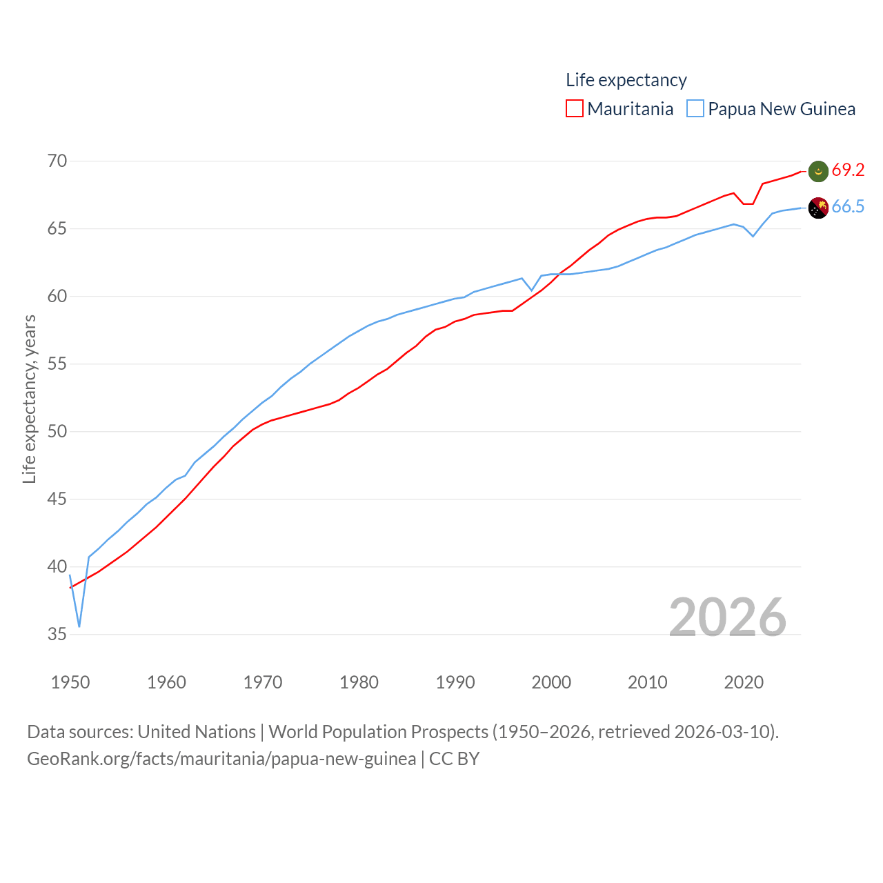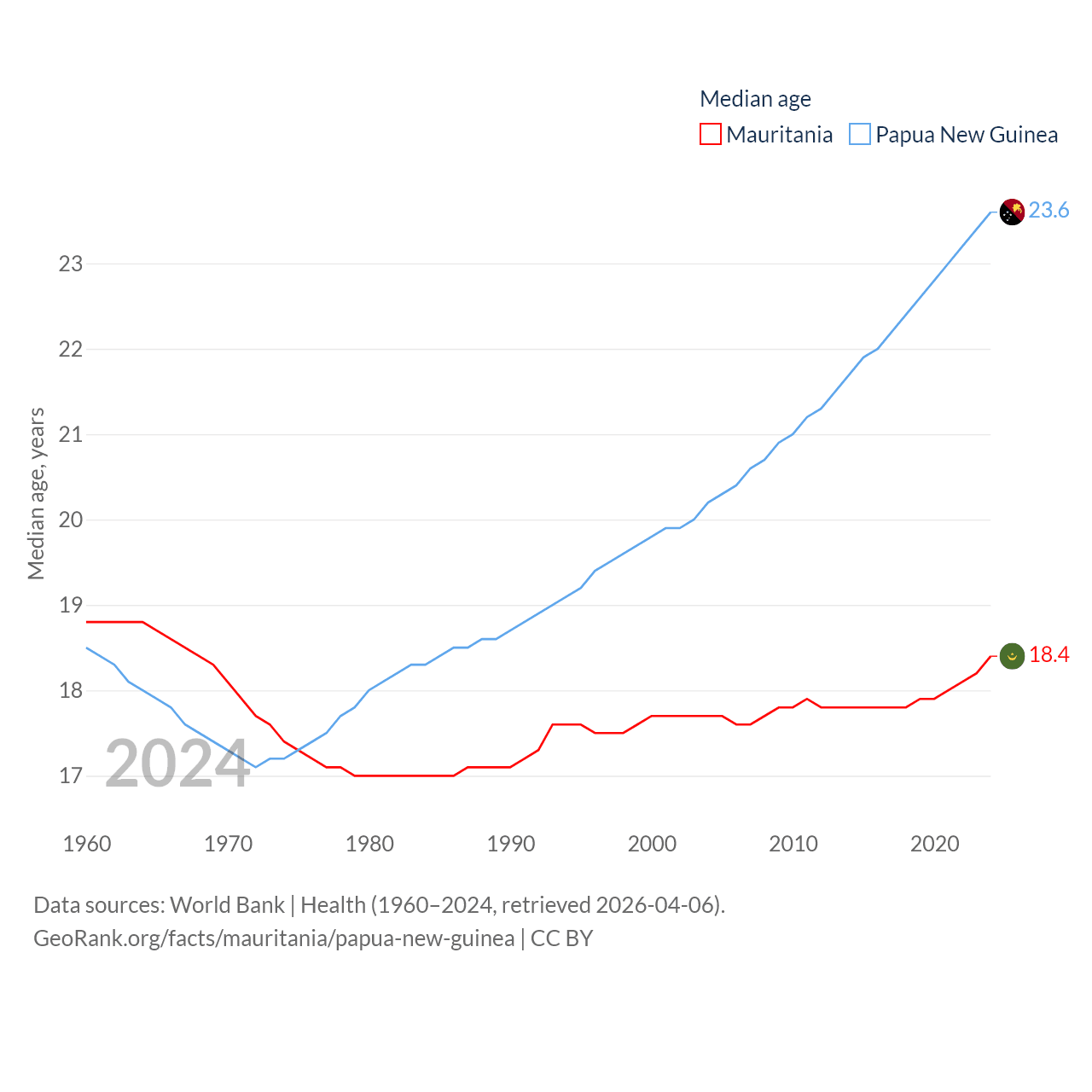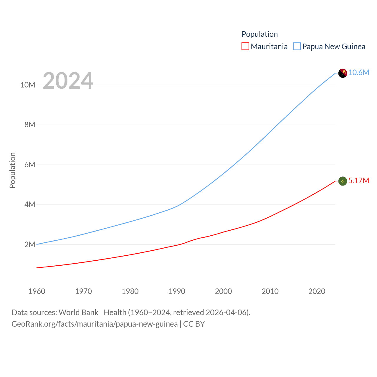 Mauritania has a population of 5.17M (ranked 125/197), compared with 10.6M in Papua New Guinea (ranked 92/197). Mauritania's land area is 397,955 sq mi versus 174,850 sq mi for Papua New Guinea (ranked 28th vs. 54th).
