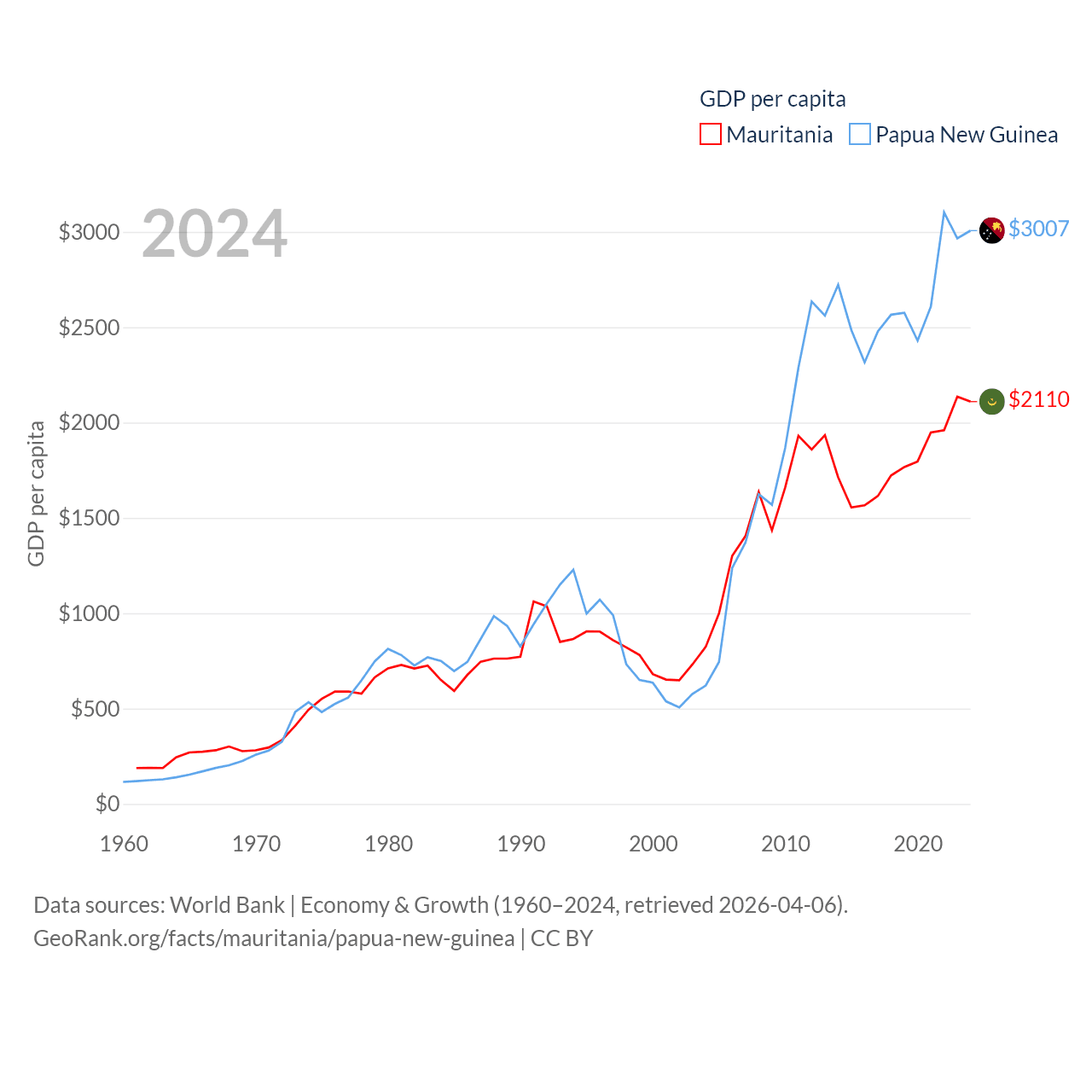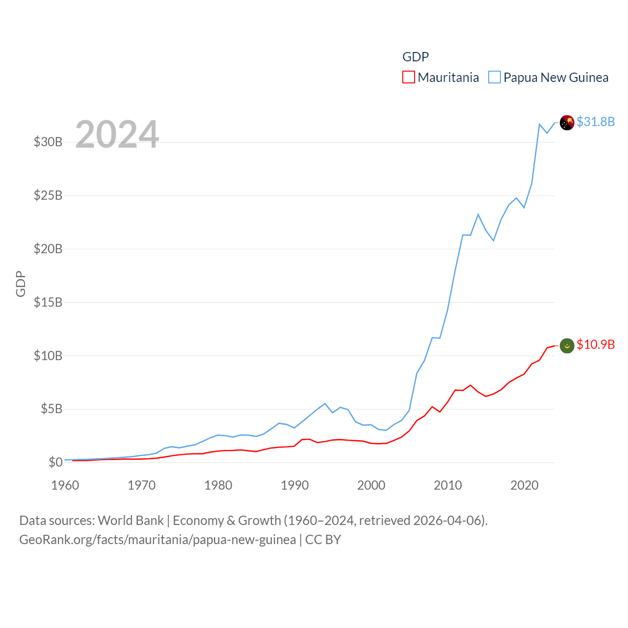 By GDP, Mauritania ranks 153/197 ($10.9B) and Papua New Guinea ranks 110/197 ($31.8B). By GDP per capita, Mauritania ranks 156/197 ($2,110), while Papua New Guinea ranks 140/197 ($3,007).