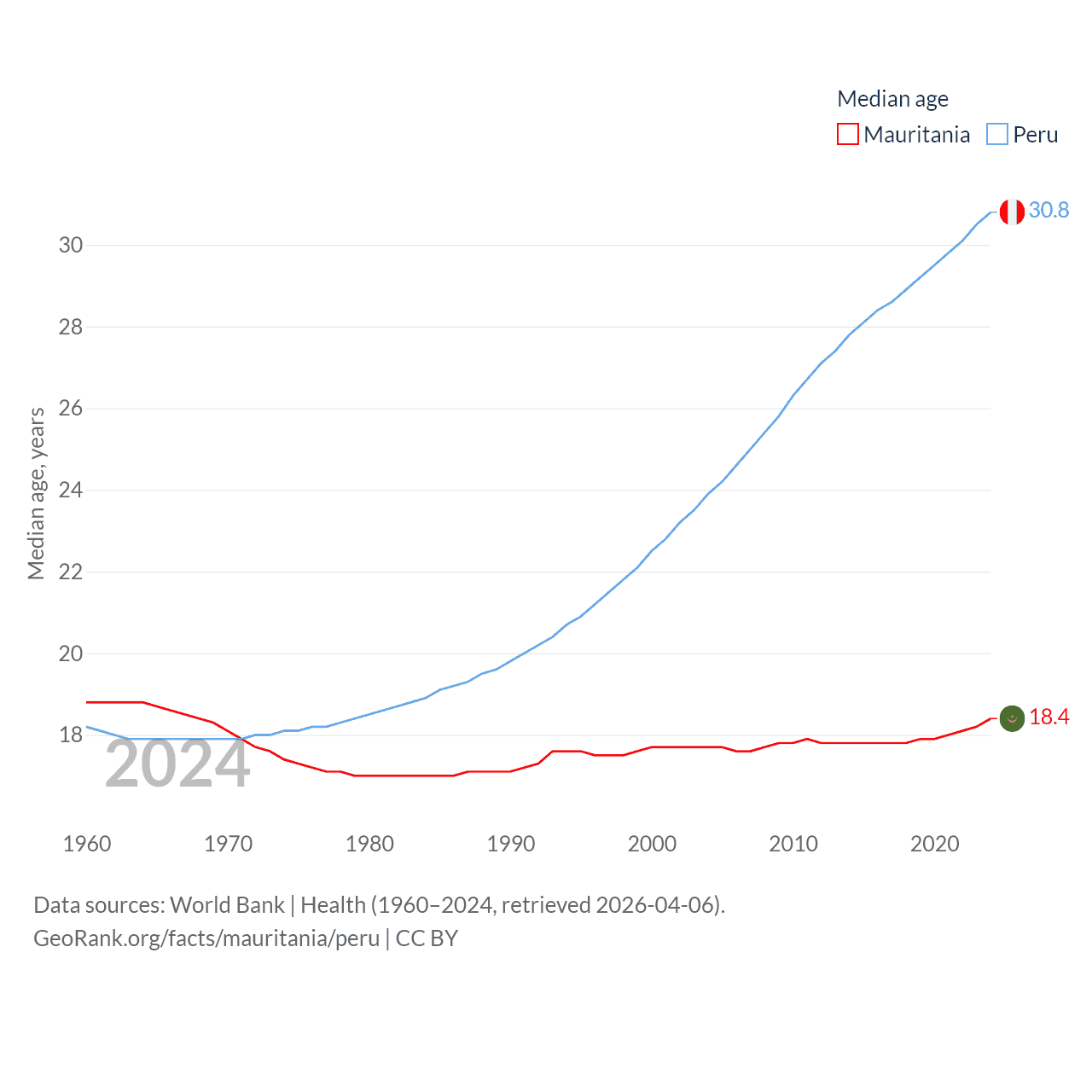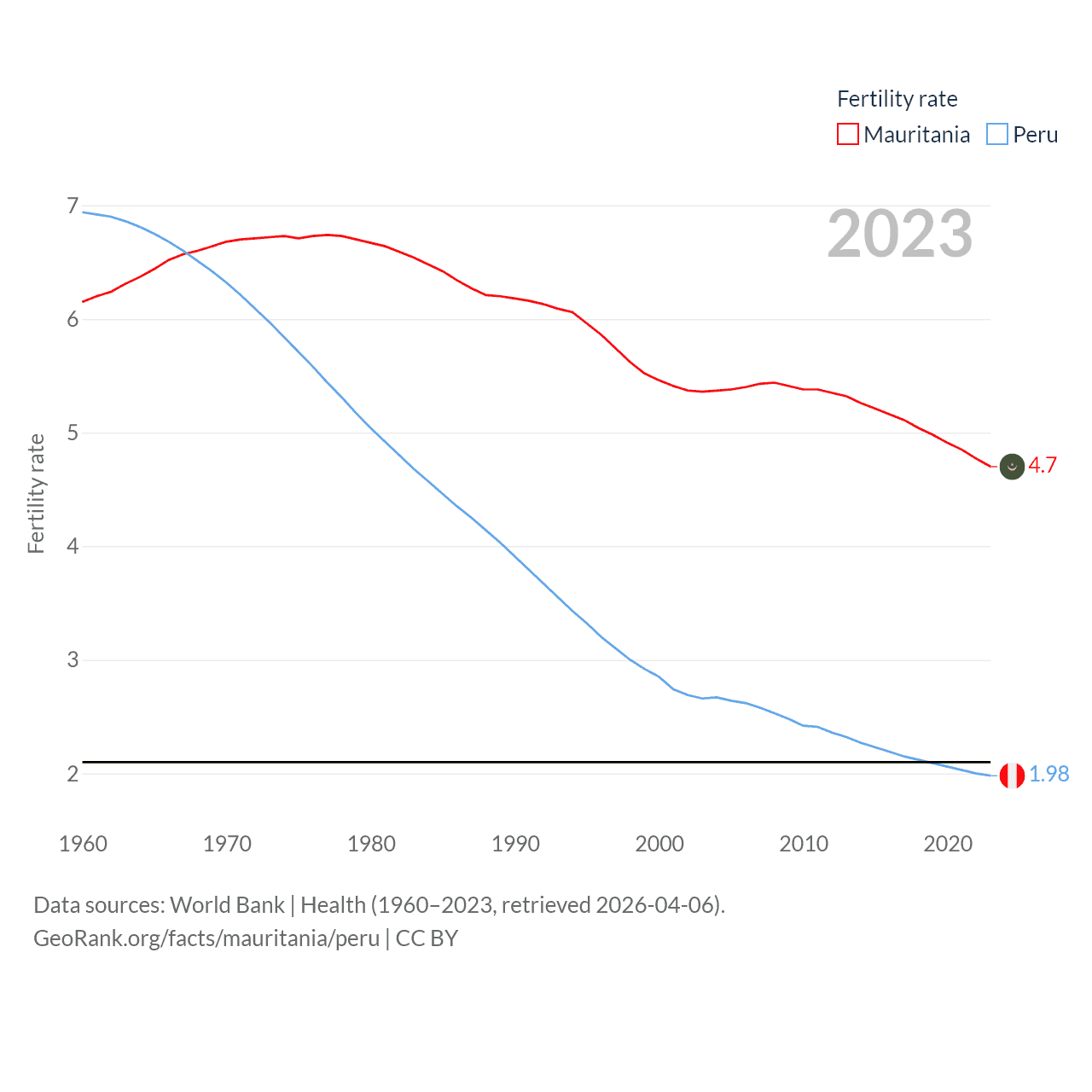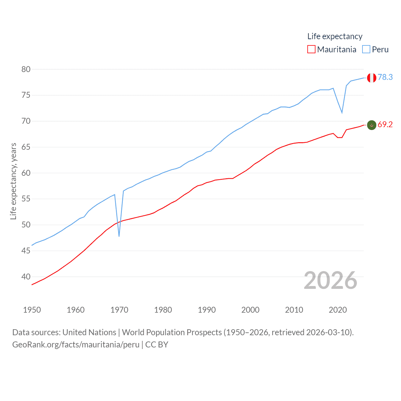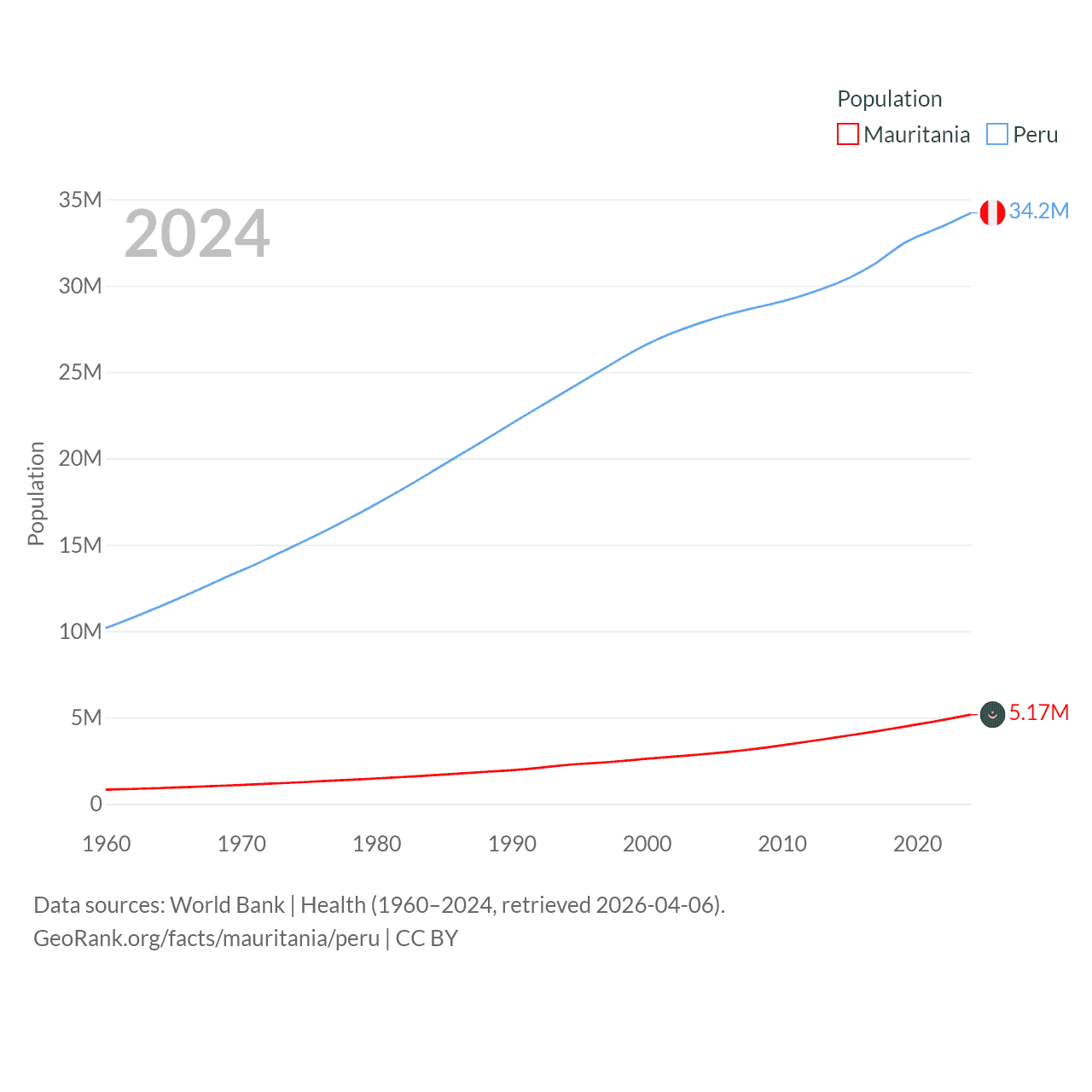 Mauritania has a population of 5.17M (ranked 125/197), compared with 34.2M in Peru (ranked 48/197). Mauritania's land area is 397,955 sq mi versus 494,211 sq mi for Peru (ranked 28th vs. 19th).