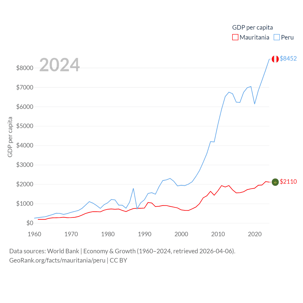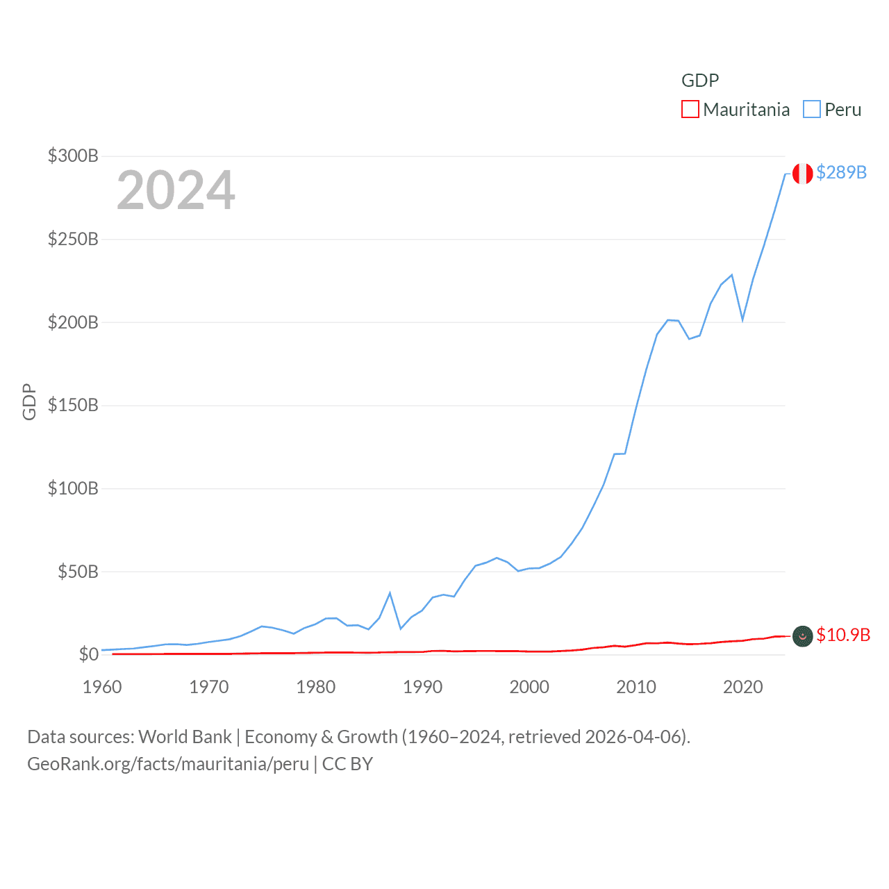 By GDP, Mauritania ranks 153/197 ($10.9B) and Peru ranks 49/197 ($289B). By GDP per capita, Mauritania ranks 156/197 ($2,110), while Peru ranks 91/197 ($8,452).