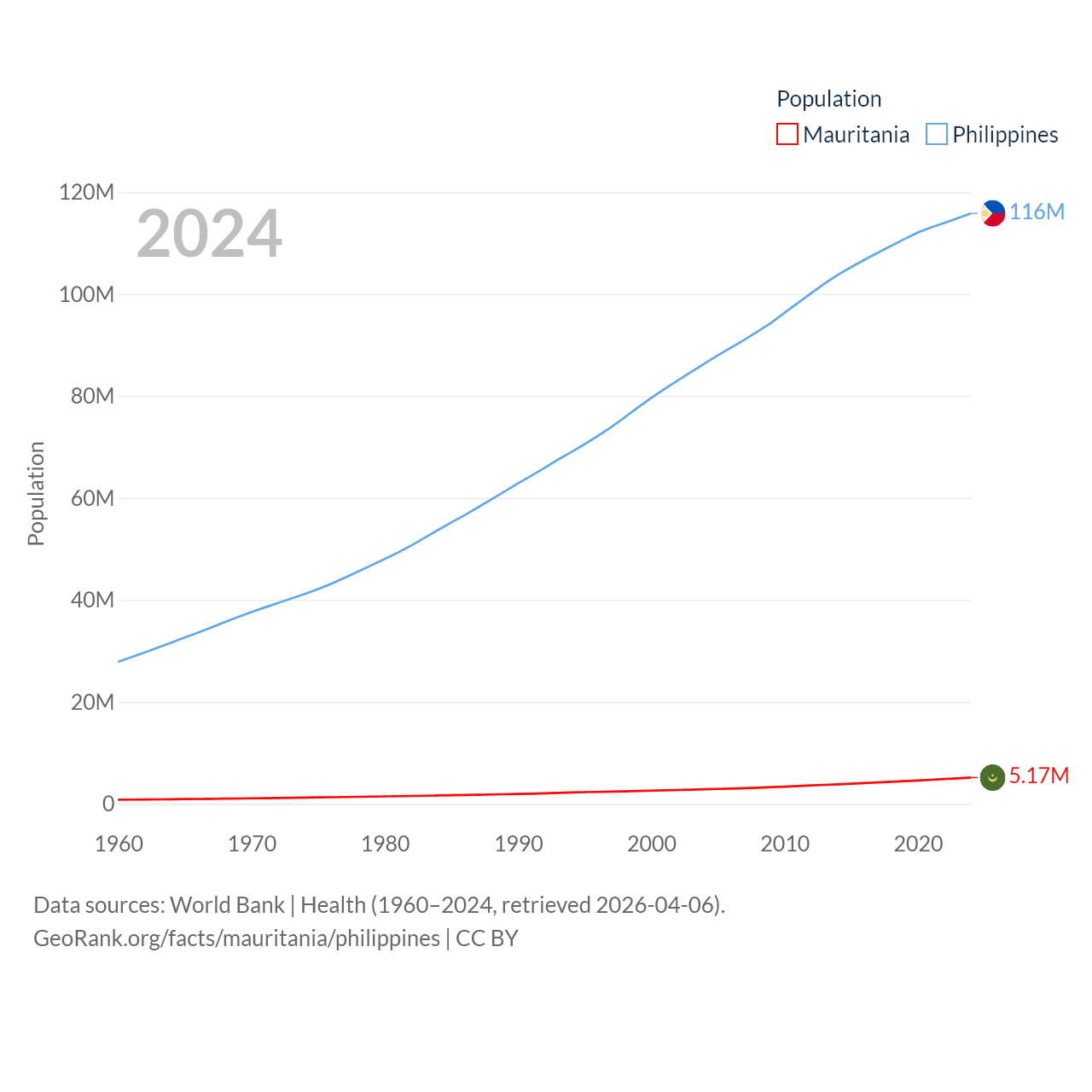 Mauritania has a population of 5.17M (ranked 125/197), compared with 116M in The Philippines (ranked 14/197). Mauritania's land area is 397,955 sq mi versus 115,124 sq mi for The Philippines (ranked 28th vs. 71st).