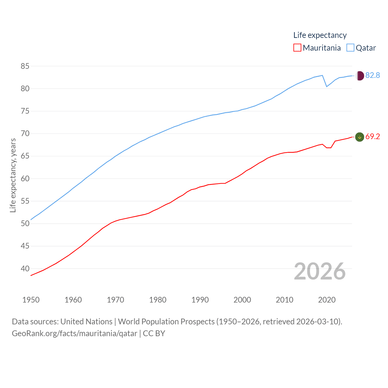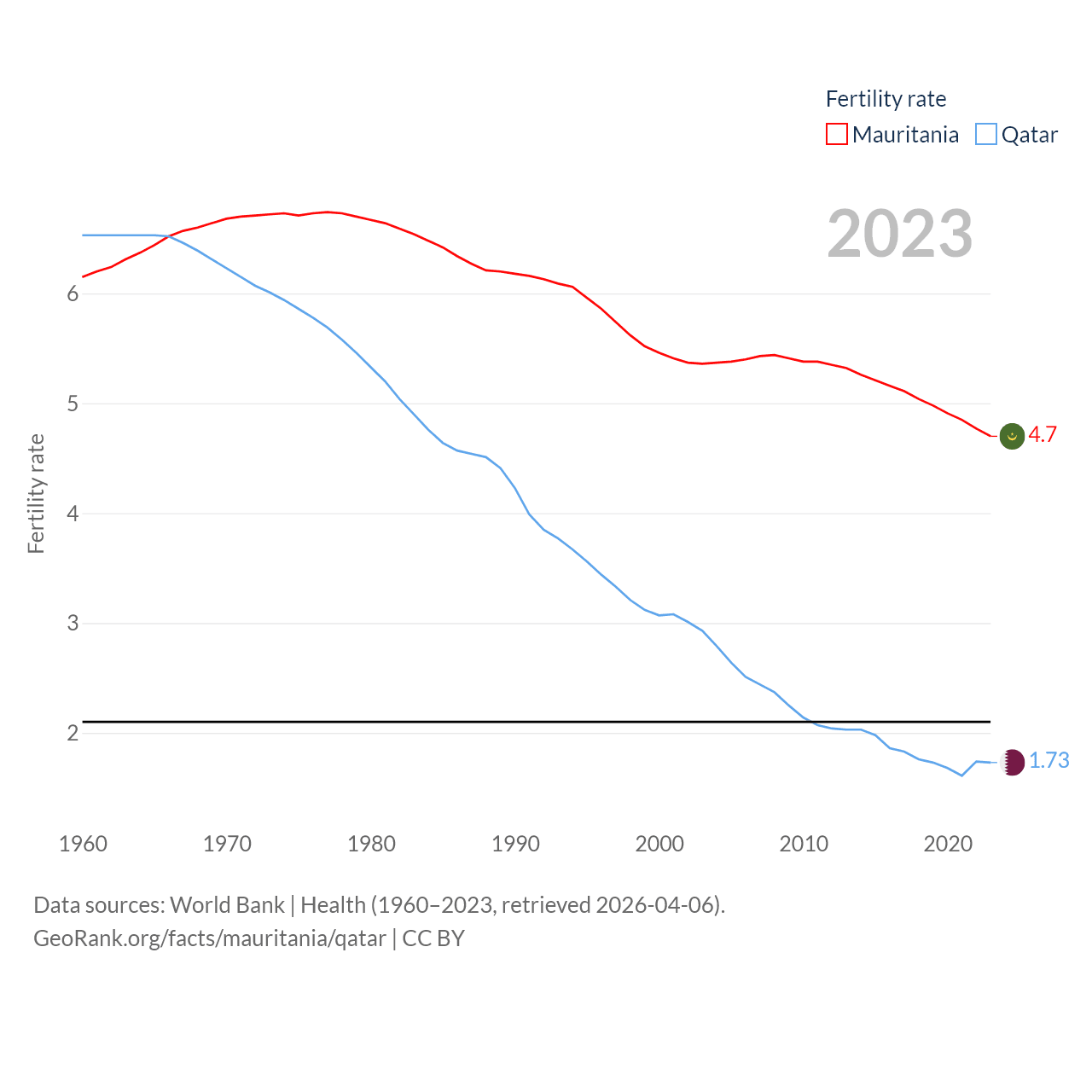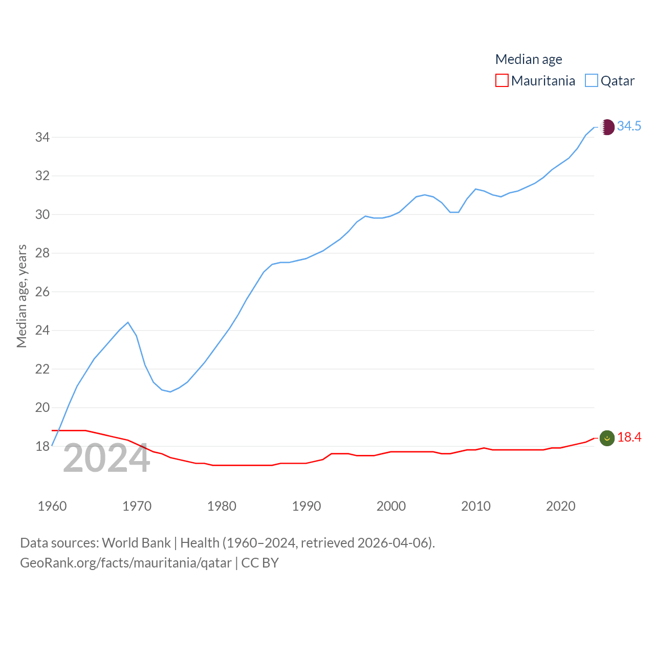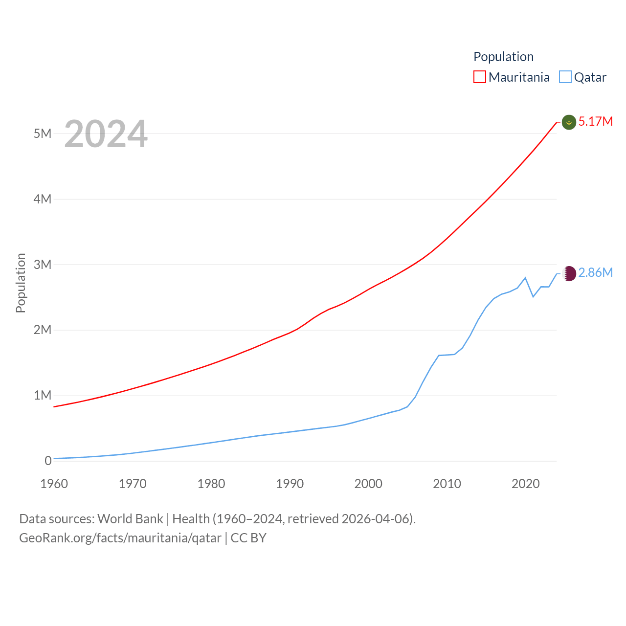 Mauritania has a population of 5.17M (ranked 125/197), compared with 2.86M in Qatar (ranked 138/197). Mauritania's land area is 397,955 sq mi versus 4,436 sq mi for Qatar (ranked 28th vs. 158th).