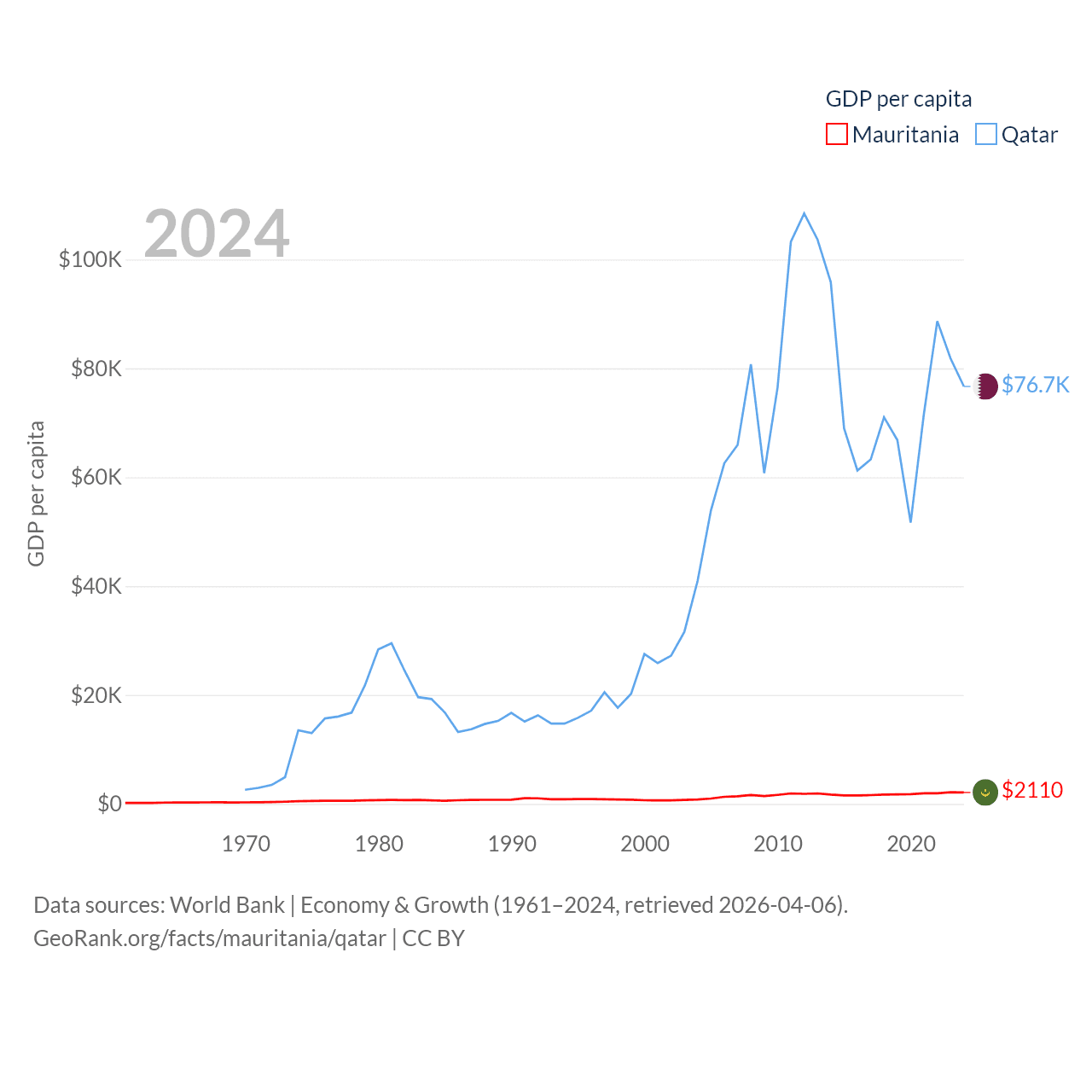 By GDP, Mauritania ranks 153/197 ($10.9B) and Qatar ranks 56/197 ($219B). By GDP per capita, Mauritania ranks 156/197 ($2,110), while Qatar ranks 11/197 ($76,689).