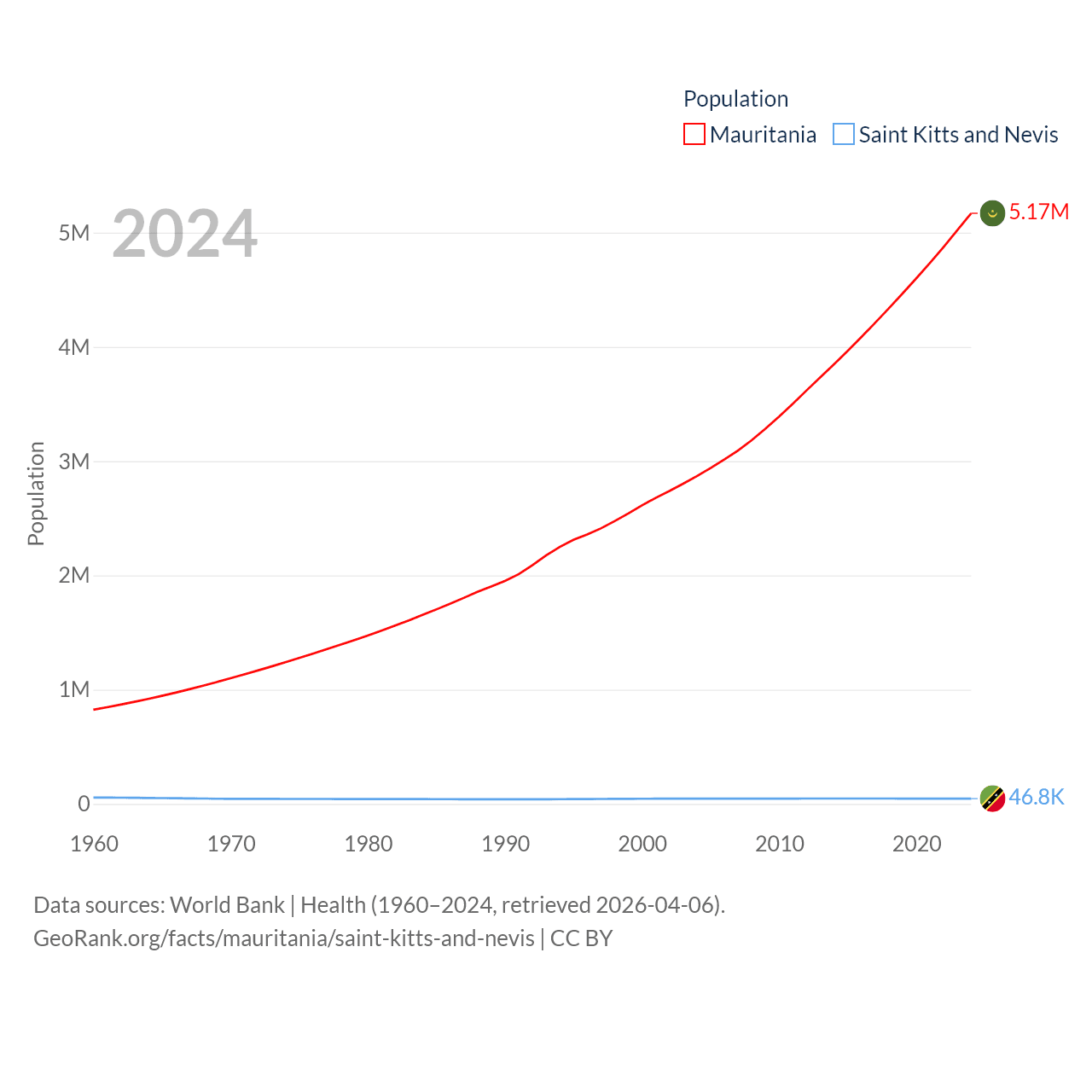Mauritania has a population of 5.17M (ranked 125/197), compared with 46.8K in Saint Kitts and Nevis (ranked 189/197). Mauritania's land area is 397,955 sq mi versus 100.4 sq mi for Saint Kitts and Nevis (ranked 28th vs. 189th).