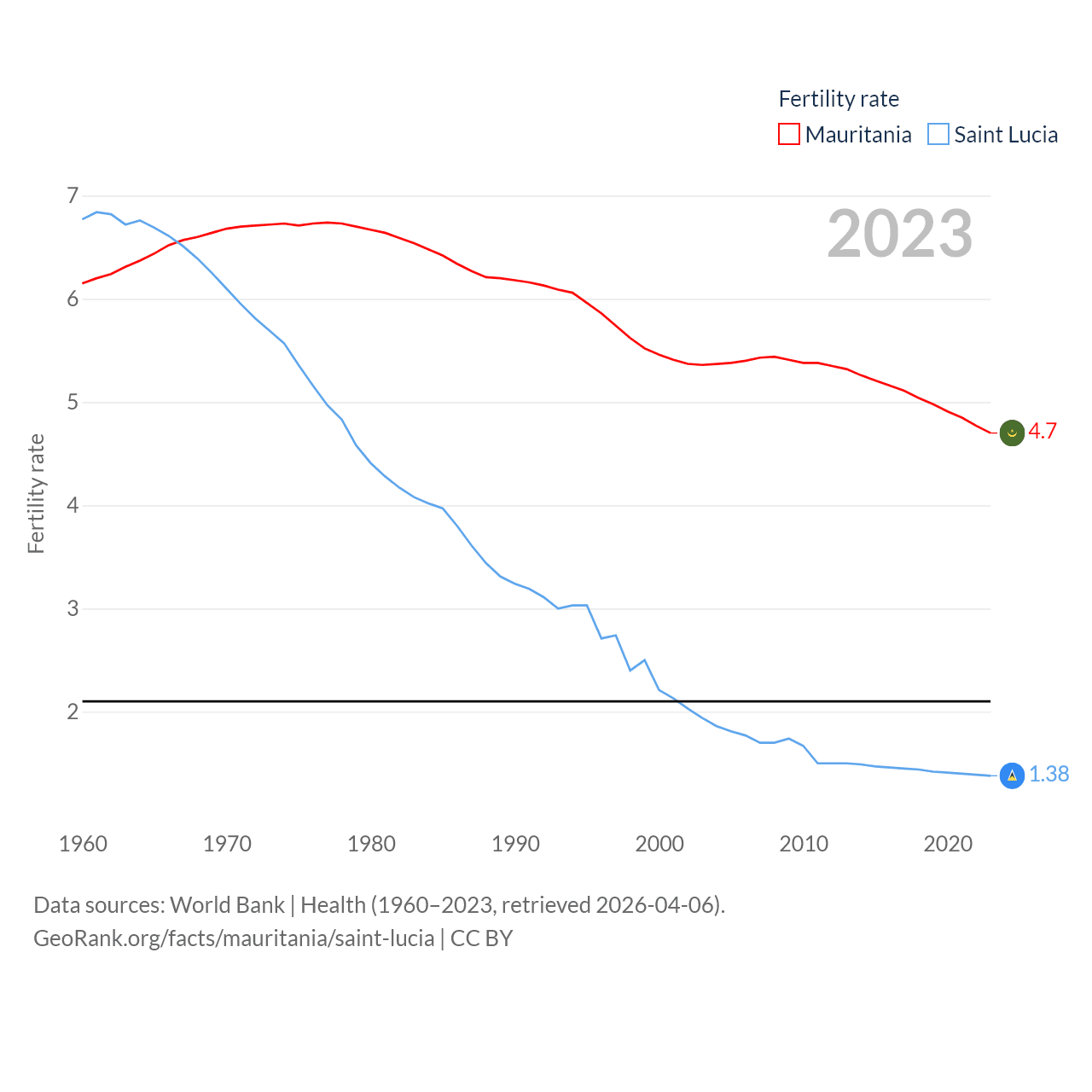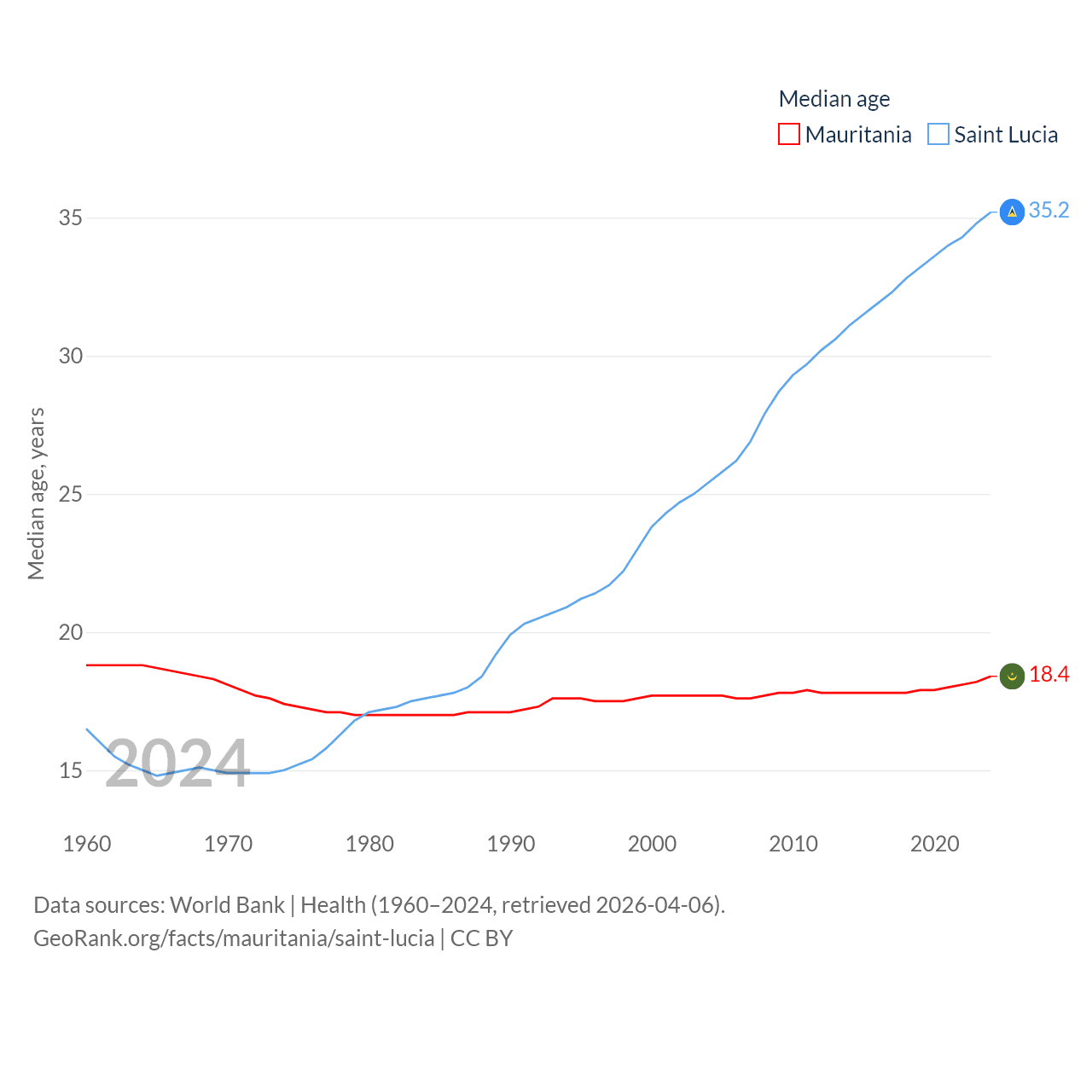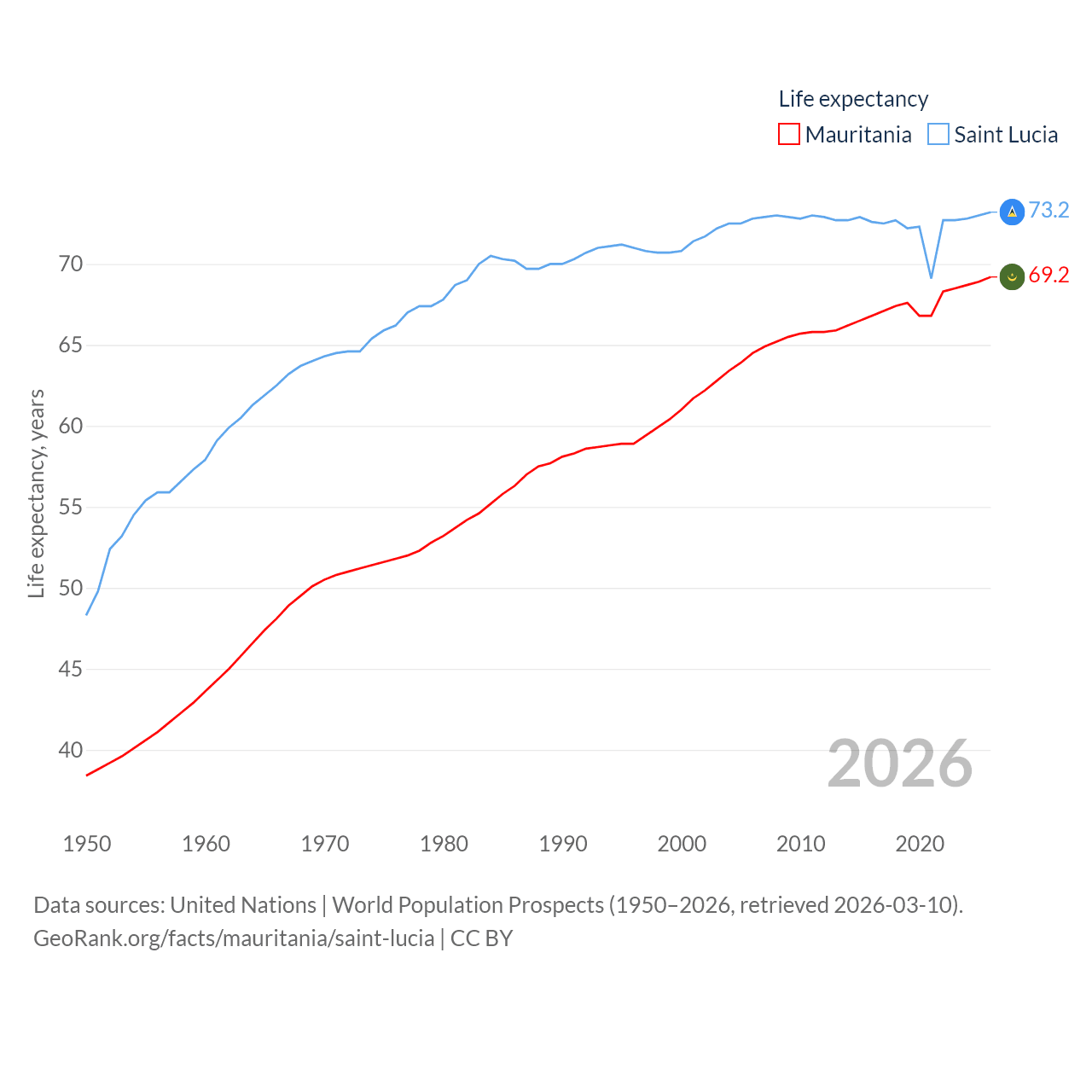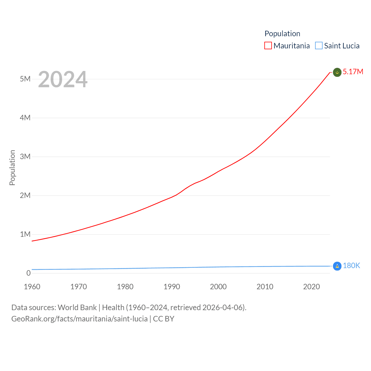 Mauritania has a population of 5.17M (ranked 125/197), compared with 180K in Saint Lucia (ranked 178/197). Mauritania's land area is 397,955 sq mi versus 235.5 sq mi for Saint Lucia (ranked 28th vs. 178th).