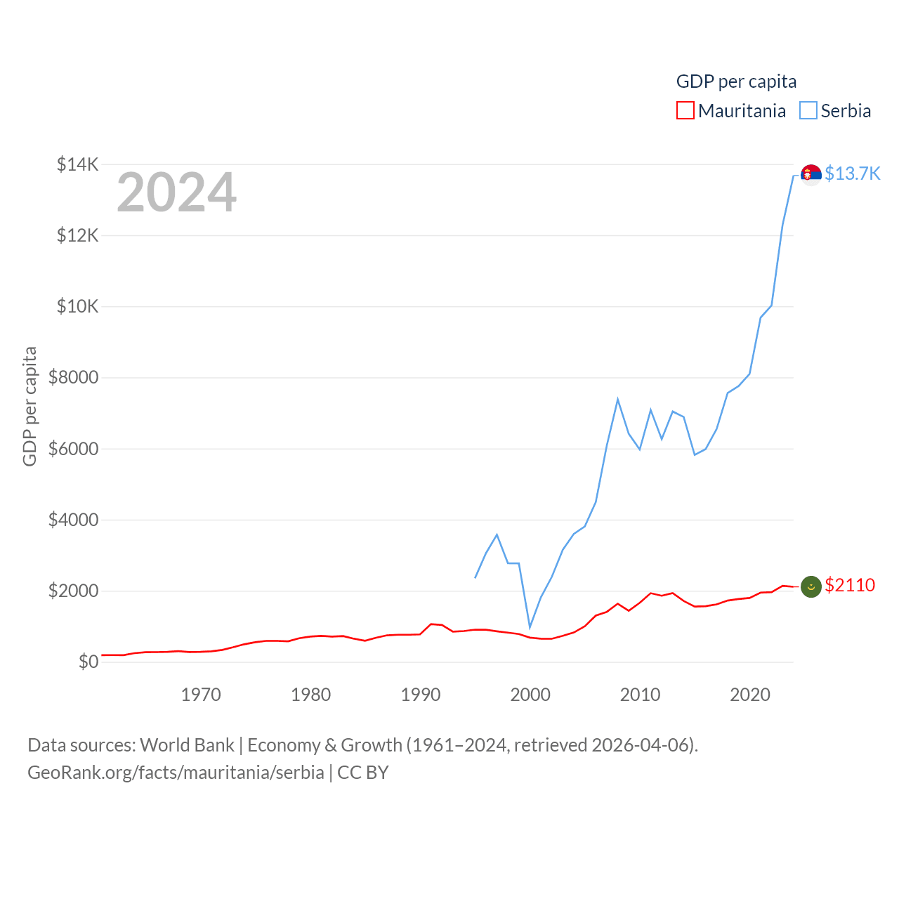 By GDP, Mauritania ranks 153/197 ($10.9B) and Serbia ranks 76/197 ($90.1B). By GDP per capita, Mauritania ranks 156/197 ($2,110), while Serbia ranks 73/197 ($13,679).